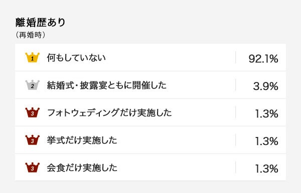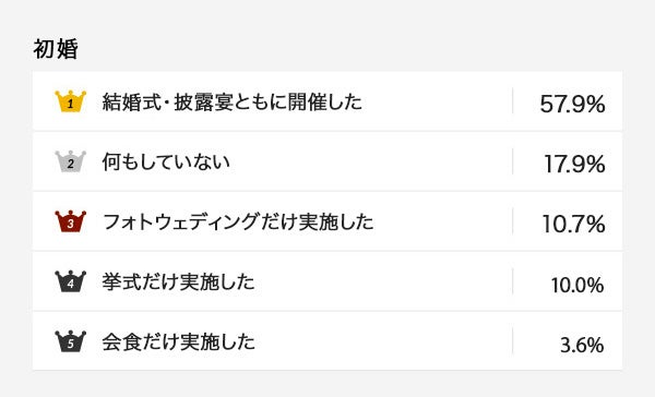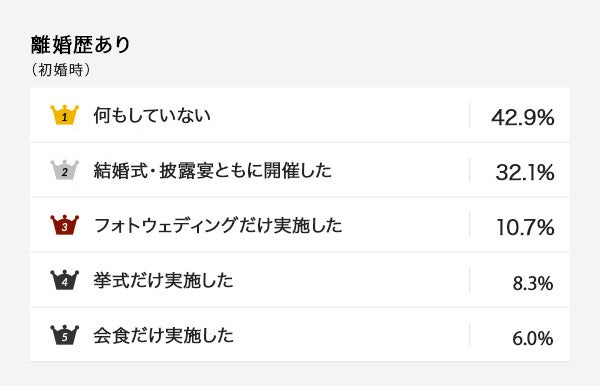 アンケート結果の中で、離婚歴のある方においては初婚時「何もしていない」が42.9%と離婚歴のない方の17.9%と比べて倍以上の差がありました。結婚式というビッグイベントを通じてふたりの関係が強固になり、家族や友人から祝福を受ける節目があることで、その後の夫婦関係に影響を及ぼすのかもしれません。