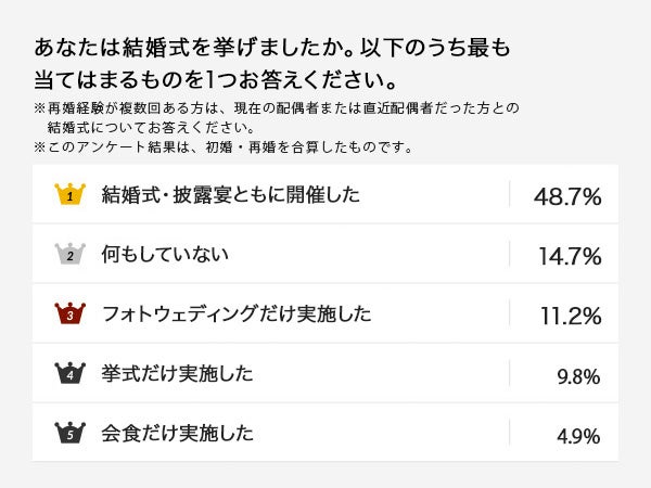 「結婚式・披露宴ともに開催した」が48.7%で約半数となり、2番目に「何もしていない」が14.7%、続いて「フォトウェディングだけ実施した」11.2%、「挙式だけ実施した」9.8%、「会食だけ実施した」4.9%という結果になりました。