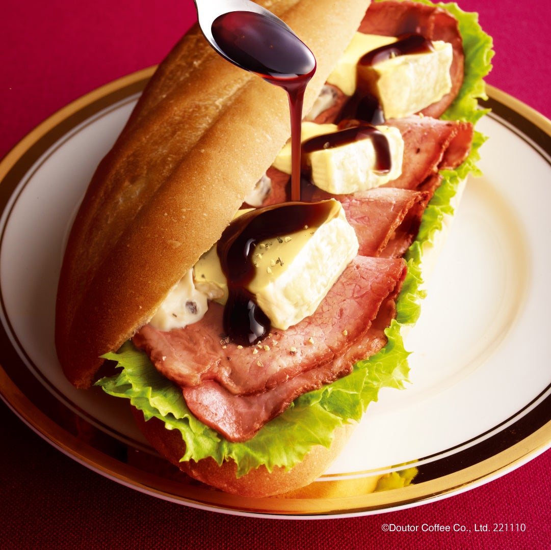 ドトール自慢のしっとり・やわらかなローストビーフを引き立てる相性のいい2種のソースは、赤ワインとバルサミコ酢の入った芳醇でフルーティーな味わいのソースと、マッシュルームなどのきのこペースト、白トリュフオイルが入ったマヨソース。