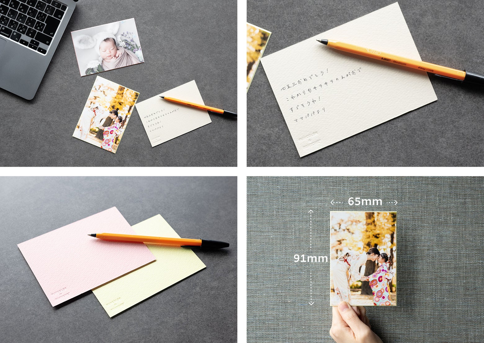 『FUJICOLOR フォトメッセージカード』はメッセージを書き込める上質な紙質や手触り感にこだわった、贈り物にも最適なフォトメッセージカードです。約1㎜の厚みでしっかりとした仕上がり、Vカットによるフレーム効果、高級感のある仕様で、撮影した思い出を特別なカタチで残すことができます。