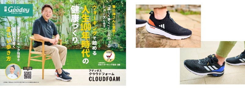 株式会社チヨダ(東京都杉並区 代表取締役社長 町野 雅俊)は、アディダスの最新ウォーキングシューズ『CLOUDFOAM』シリーズを、全国のシュープラザ、東京靴流通センター、公式オンラインショップなどで発売します。元力士で大相撲解説者の舞の海 秀平さんと健康ウオーキング指導士の坂田 純子さんが、「日経Gooday」のタイアップ記事にて対談した様子をキービジュアルに採用しています。