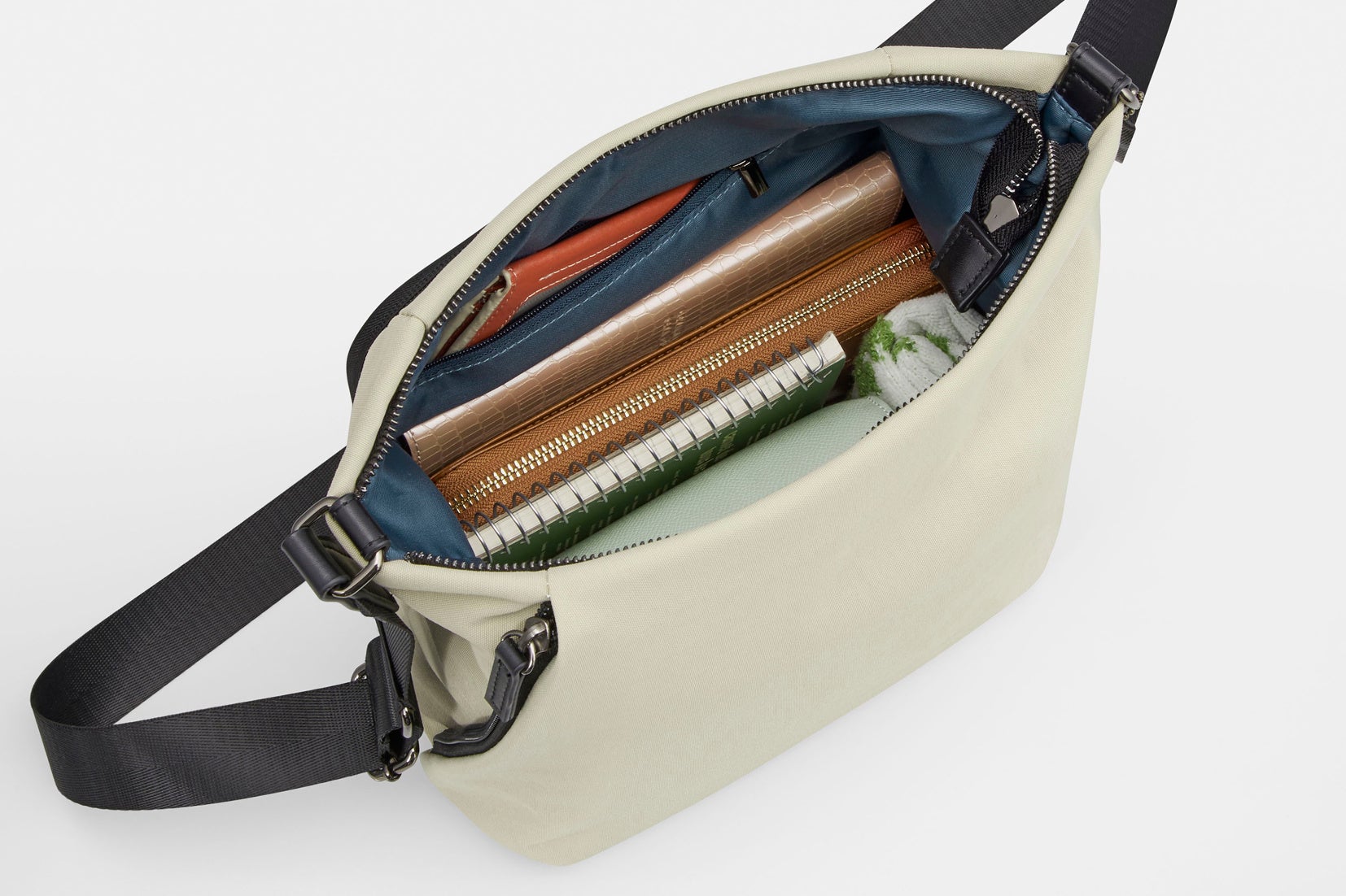 内装には小物の収納に便利なポケットが充実。中身が飛び出さないファスナーポケットや、中身が一目でわかるオープンポケットが付いています。