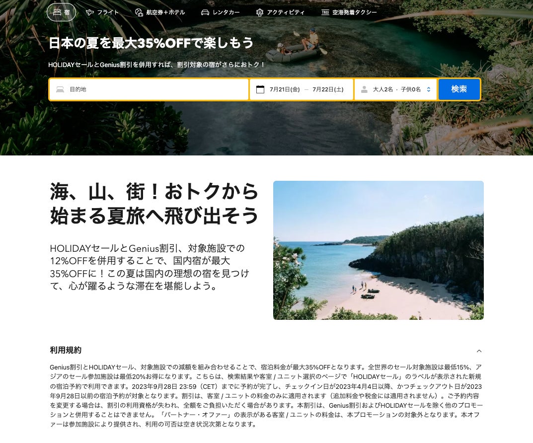 内容:HOLIDAYセールとGenius割引、対象施設での12%OFFを併用することで、国内宿が最大35%OFFになります。