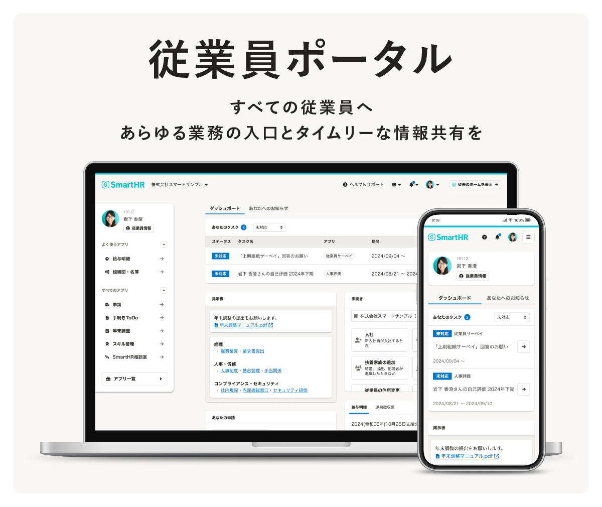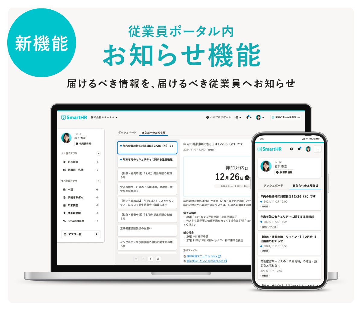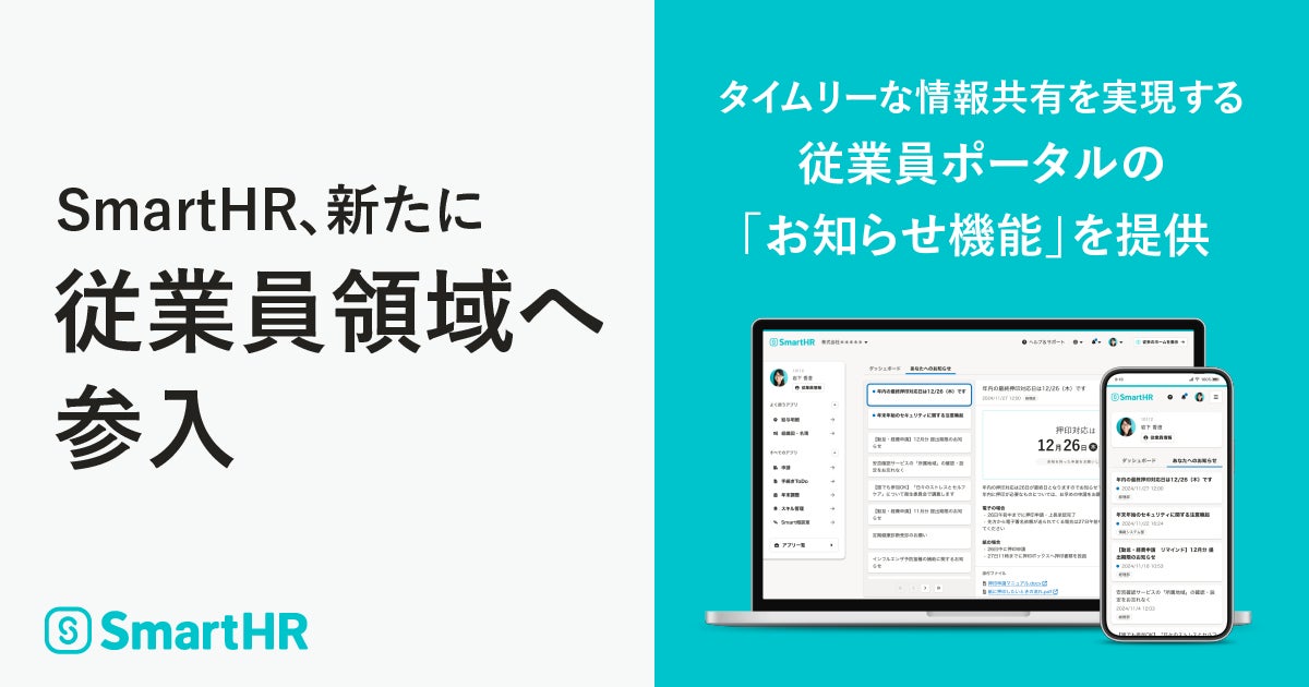 株式会社SmartHR(本社:東京都港区、代表取締役CEO:芹澤 雅人)が運営するクラウド人事労務ソフト「SmartHR(スマートエイチアール)」は、従業員の業務効率化を実現する“従業員領域”へと新たに参入し、従業員ポータルの「お知らせ機能」を2024年11月14日より提供いたします。