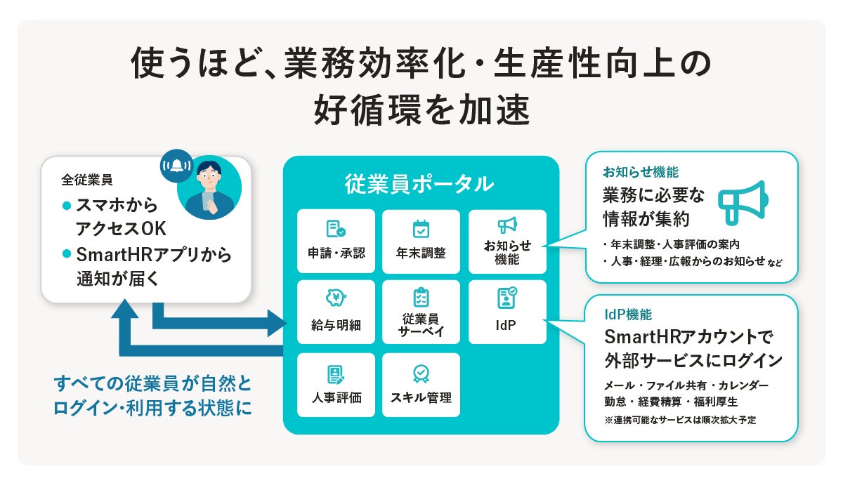 「お知らせ機能」は、「SmartHR」を利用するすべてのユーザーが一番最初にアクセスするホーム画面である「従業員ポータル」上で、業務に必要な情報共有をタイムリーに行えます。「従業員ポータル」には、外部サービスへのスムーズなログインを叶える「IdP機能」や給与明細の配付・人事評価・各種労務手続きなど、さまざまな機能の窓口が集約されており、バックオフィスと従業員をつなぐフロントシステムとして情報伝達から業務効率化までを一気通貫で後押しします。