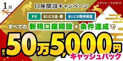 株式会社 マネーパートナーズ(代表取締役社長:福島秀治、本社:東京都港区、以下「当社」)は、2023年1月の新規口座開設者向けキャンペーンとして、『FX(外国為替証拠金取引)、まいにち金・銀(商品CFD取引)、まいにち暗号資産(暗号資産CFD取引)』新規口座開設と条件達成で最大505,000円をキャッシュバックするキャンペーンを実施いたしております。