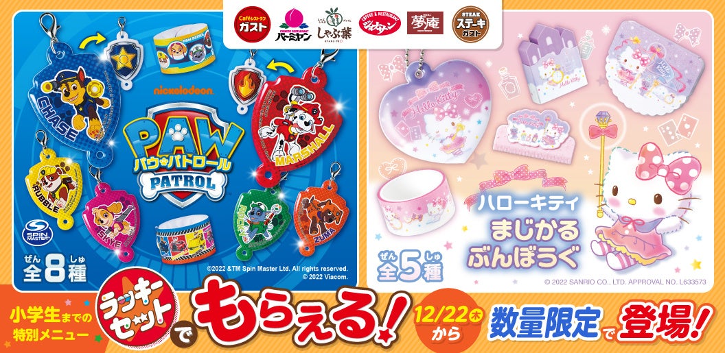 株式会社すかいらーくレストランツ(本社・東京都武蔵野市、代表取締役社長 中島 尚志)が運営するガストなど6ブランドにて、2022年12月22日(木)より、ラッキーセットご注文時にもらえる限定オリジナルカプセルトイに、「パウ・パトロール」と「ハローキティ」が登場いたします。