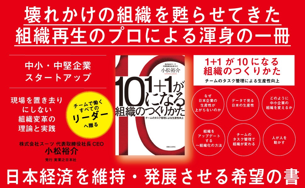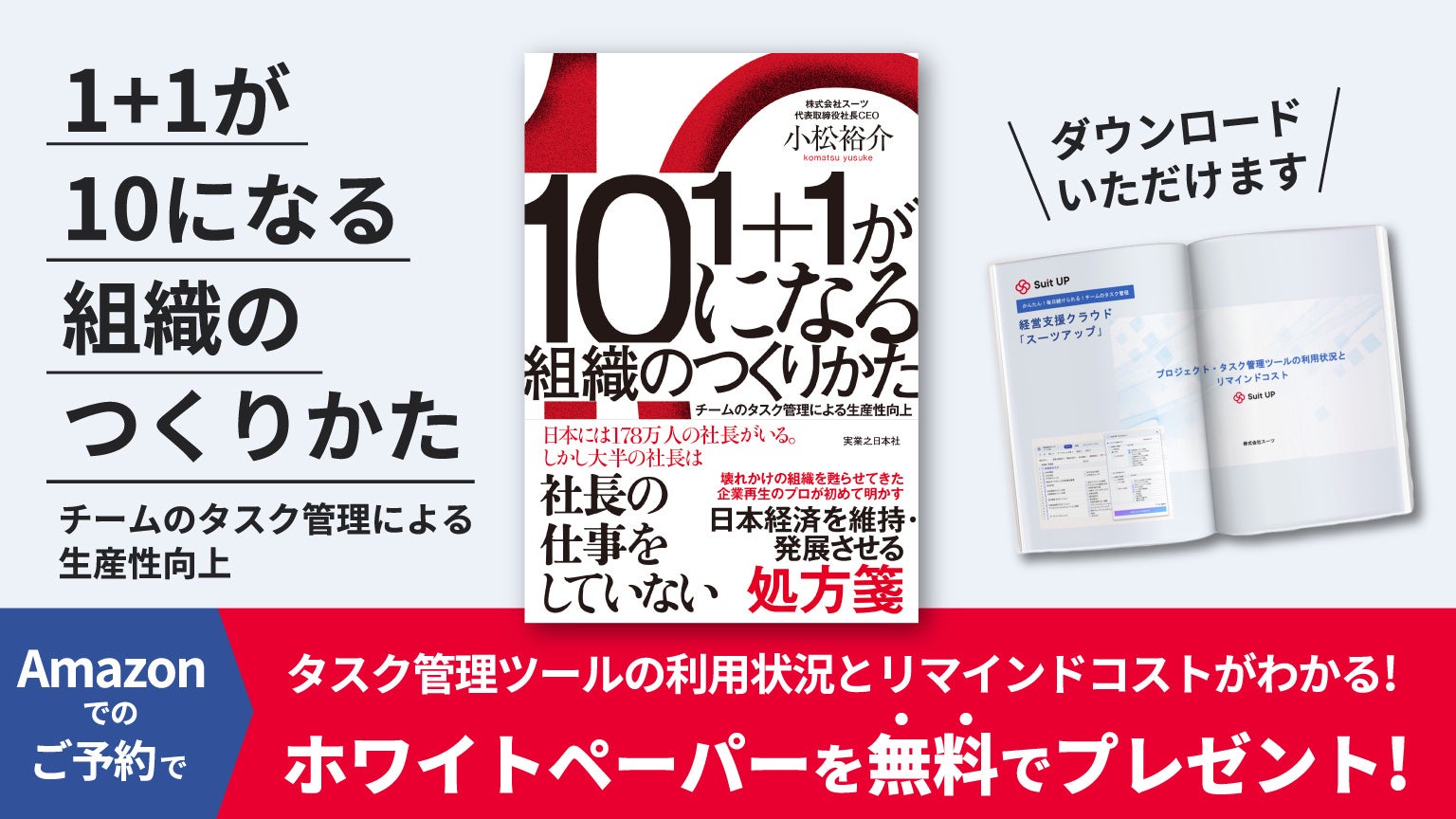 株式会社スーツ(所在地:東京都千代田区、代表取締役社長CEO:小松 裕介)は、2025年5月29日に発売予定の当社代表者である小松裕介の初著書となる『1+1が10になる組織のつくりかた チームのタスク管理による生産性向上』(実業之日本社)をAmazon.co.jpで期間内にご予約いただいた方に、ホワイトペーパー「プロジェクト・タスク管理ツールの利用状況とリマインドコスト」をPDF化してプレゼントいたします。
