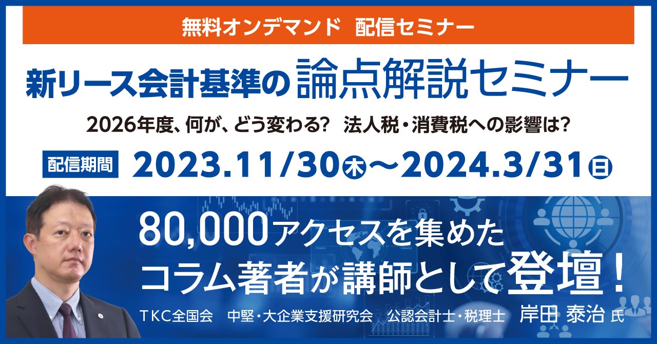 株式会社TKC(本社:栃木県宇都宮市/代表取締役社長:飯塚真規)は、「2007年以来の大改正」とも言われるリース会計基準の改正を受けて、「新リース会計基準の論点解説セミナー」を期間限定(2024年3月末期限)で無料配信することをお知らせします。
