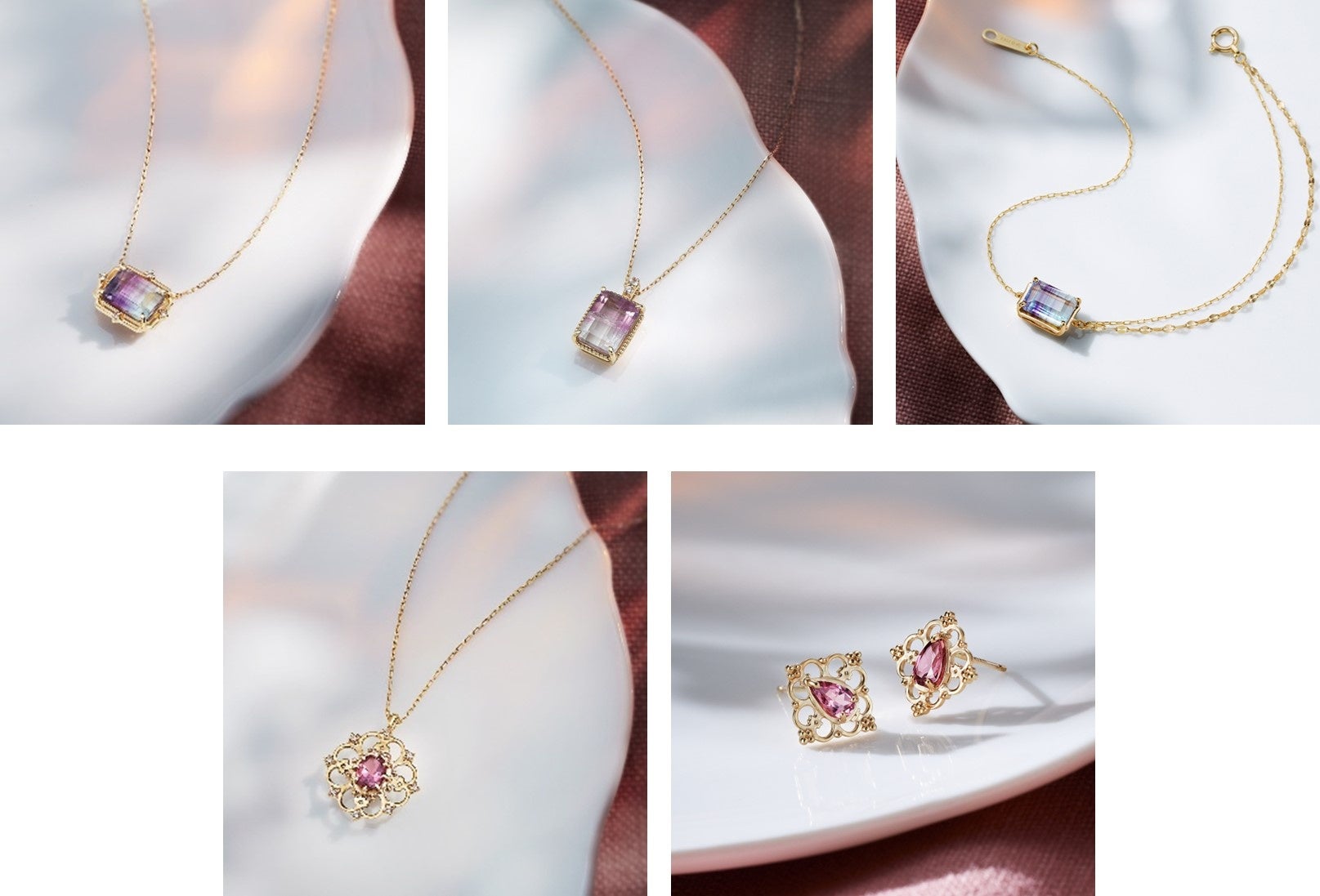 ヴェルサイユ宮殿に飾られる豪華絢爛な絵画をイメージし、細かなカーブやミル打ちにより絵画の額縁を表現した上品でクラシカルなデザインも登場。「七色の宝石」とも呼ばれる、多彩な色を持つフローライトを組み合わせることで、コーディネートにアクセントを加えてくれる主役級のジュエリーに。また繊細な地金の透かしとバラのようなロゼピンクカラーのマラヤガーネットがゴージャスな印象をもたらすネックレス、ピアスも。宮殿での華やかなひと時を思わせるEAU DOUCE4℃らしい優美なジュエリーをあなたのワードローブに加えて。