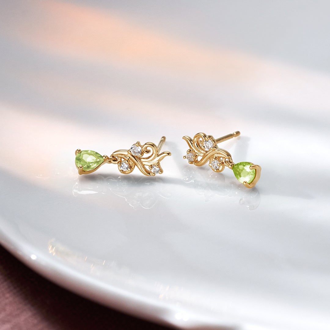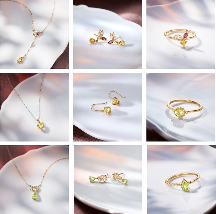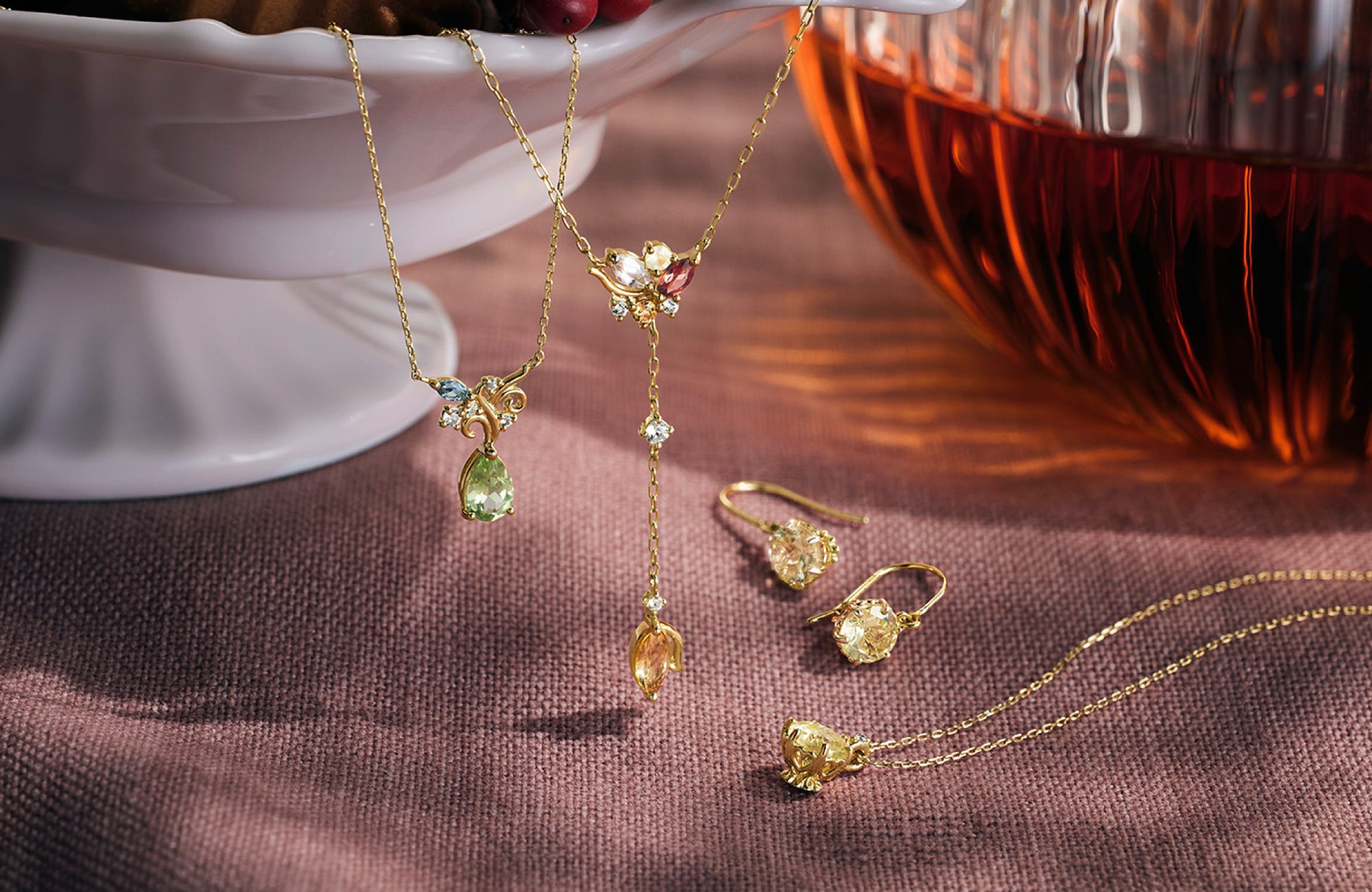 紅茶の茶葉がお湯の中でふわふわとジャンピングする様子を、カラフルなカラーストーンで表現したネックレスにピアス、リングが登場。揺れ動くモチーフが目を惹くとともに、茶葉型の透かしデザインやお茶を連想させる落ち着いたカラーリングがこなれ感を演出します。さらに、お茶会で使用する装飾たっぷりのティーカップをモチーフに、爽やかなレモンクォーツを組み合わせたデザインや、広がる湯気と香りを滑らかな地金のカーブで表現した、ペリドットのカラーが鮮やかなデザインも。優雅なお茶会のひと時を切り取ったジュエリーに、秋らしい穏やかさを感じて。