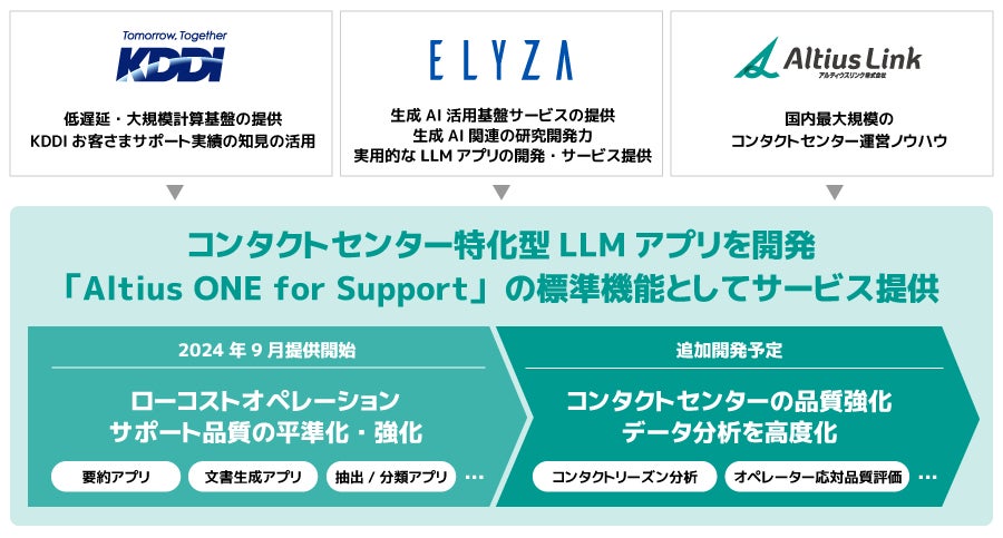 KDDI、アルティウスリンク、ELYZAは業務の効率化やデータ分析を高度化する「コンタクトセンター業務特化型LLMアプリケーション(以下 本LLMアプリ)」を開発し、2024年9月3日からアルティウスリンク提供のコンタクトセンター向けサービス「Altius ONE for Support」※1の標準機能として本LLMアプリを提供開始します。