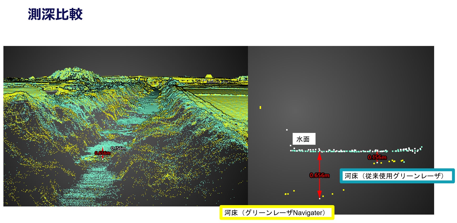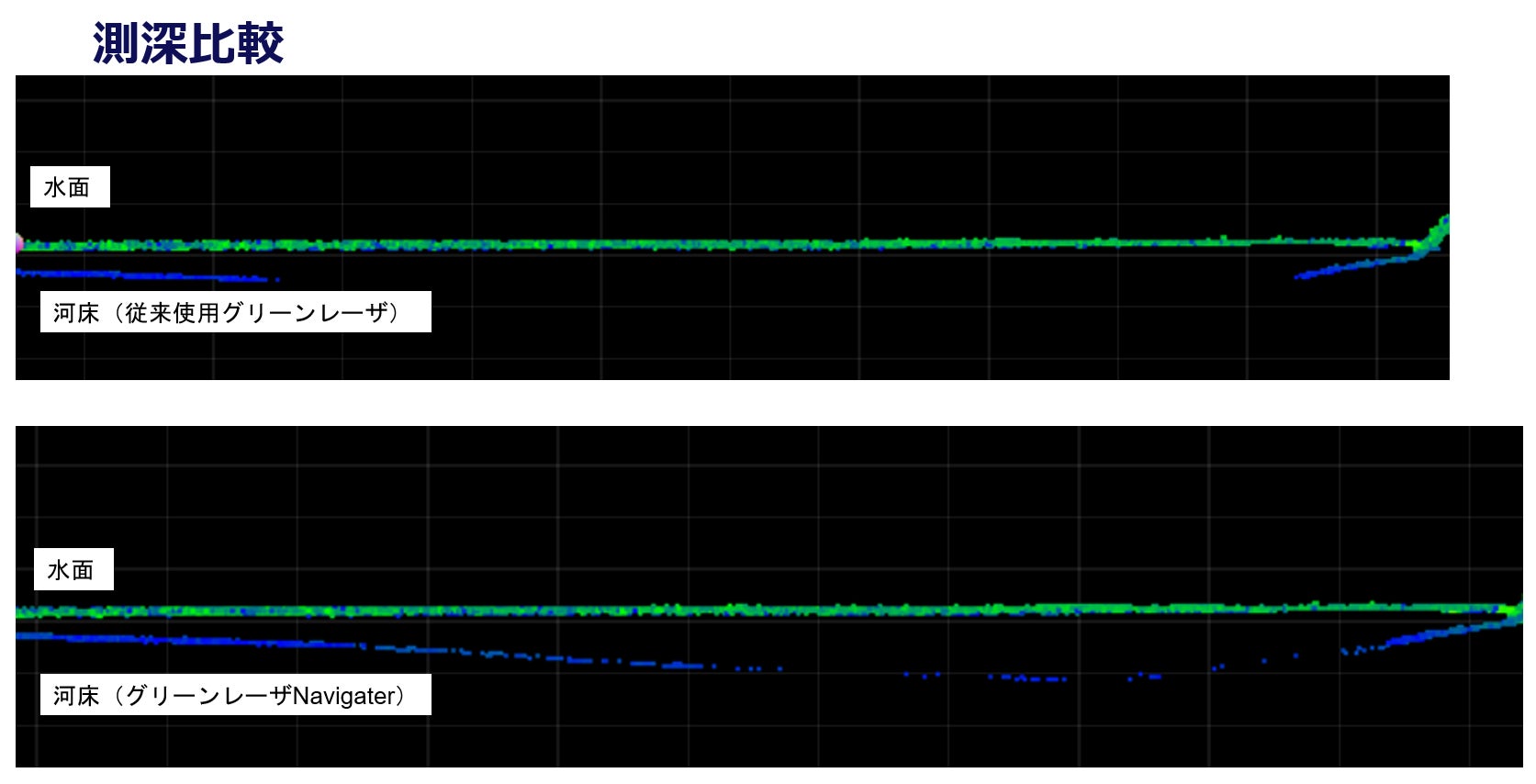 日本国内で利用が普及しているグリーンレーザでは最大1~1.2セッキが標準でしたが、本製品では最大2セッキ(※2)までの計測が可能です。これにより、今まで計測が難しかった河川や湖沼などの水域でも測量が可能となり、より詳細な地形データを取得できるようになりました。これまで測れなかった深部の地形もデータ化できる可能性が広がったため、調査の幅が広がります。