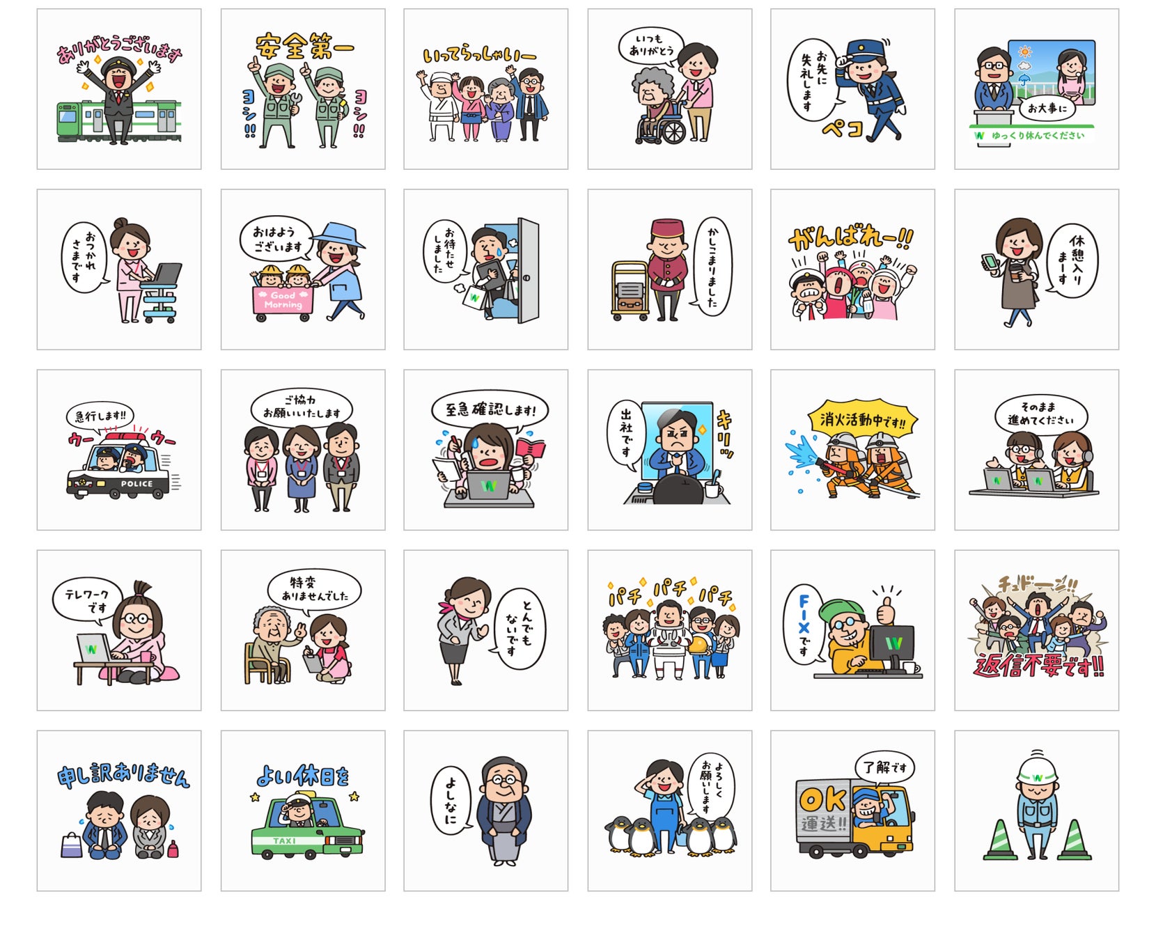 「ヒーロー」や「魔女ズキン」といったキャラクターのほか建設業や消防士などの職業系スタンプも人気です。