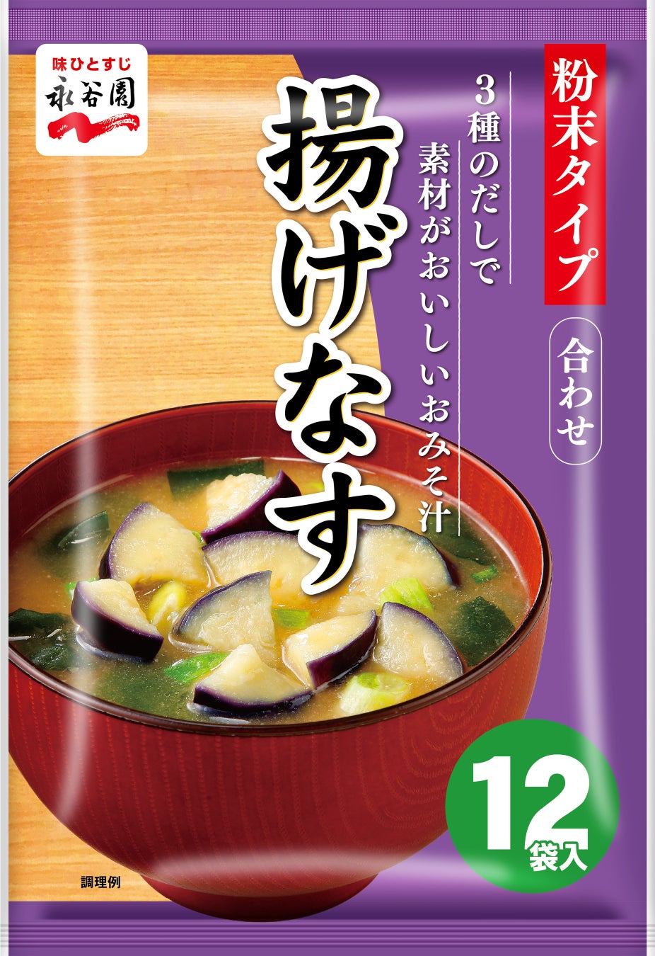 株式会社 永谷園(社長:成田 健一、東京都港区)は、3 種のだしを使ったフリーズドライ粉末タイプの即席みそ汁「3 種のだしで素材がおいしいおみそ汁 揚げなす 12 袋入」(税抜1,440 円)を、2023 年3 月6 日(月)より、Amazon ほかEC サイトにて発売いたしました。