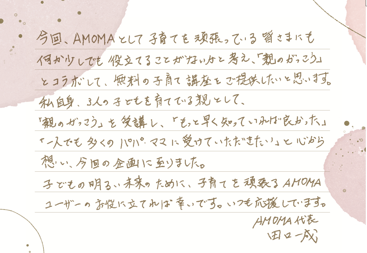 コロナ禍で子育て中のパパママの孤立が長期化する中で、AMOMA様と提携しこのような取り組みが実現できたことをとても嬉しく思っております。