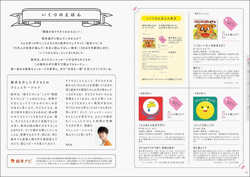 絵本ガイド「いくつのえほん」は、選ばれた全作品の内容紹介や「絵本ナビ」メンバーのママ・パパによるレビューなど、絵本選びの参考になる情報が満載の小冊子で、全国の展開書店で配布しています。レビューによって「何歳の子どもに読んで、どんな反応があったか」ということなどがわかり、絵本をプレゼントする際の参考にもなります。2024年版では、巻頭にNHK Eテレ「おかあさんといっしょ」第12代体操のお兄さん・福尾誠さんからのメッセージと、絵本を介した子どもとのコミュニケーションについてのコラムを掲載しています。