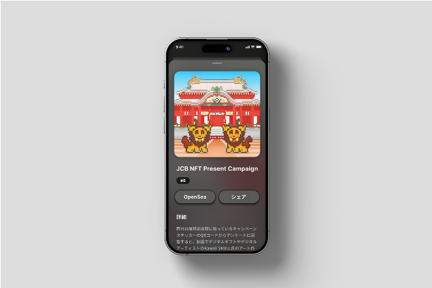 本キャンペーンは、本年4月よりJCBが実施している「JCBカードが使えるお店でラッキーチャンス!」キャンペーンを拡充したものです。キャンペーン期間中(~11月30日)に、同社の加盟店店頭に貼っているキャンペーンステッカーのQRコードからアンケートに回答すると、抽選でデジタルギフトやデジタルアーティストのKawaii SKULL氏のアート作品をモチーフにした限定NFTがプレゼントされます。また、本キャンペーンへの参加1回につき1円が、首里城未来基金(https://www.shurijo-fukkou.jp/)へ寄附されます*2。