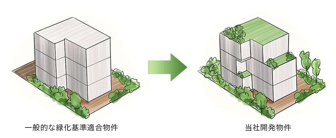 当社が開発する物件において、各自治体の緑化基準(竣工時点)を上回る緑化を行い、年間100坪(330㎡)以上の緑化面積を確保する取り組みです。