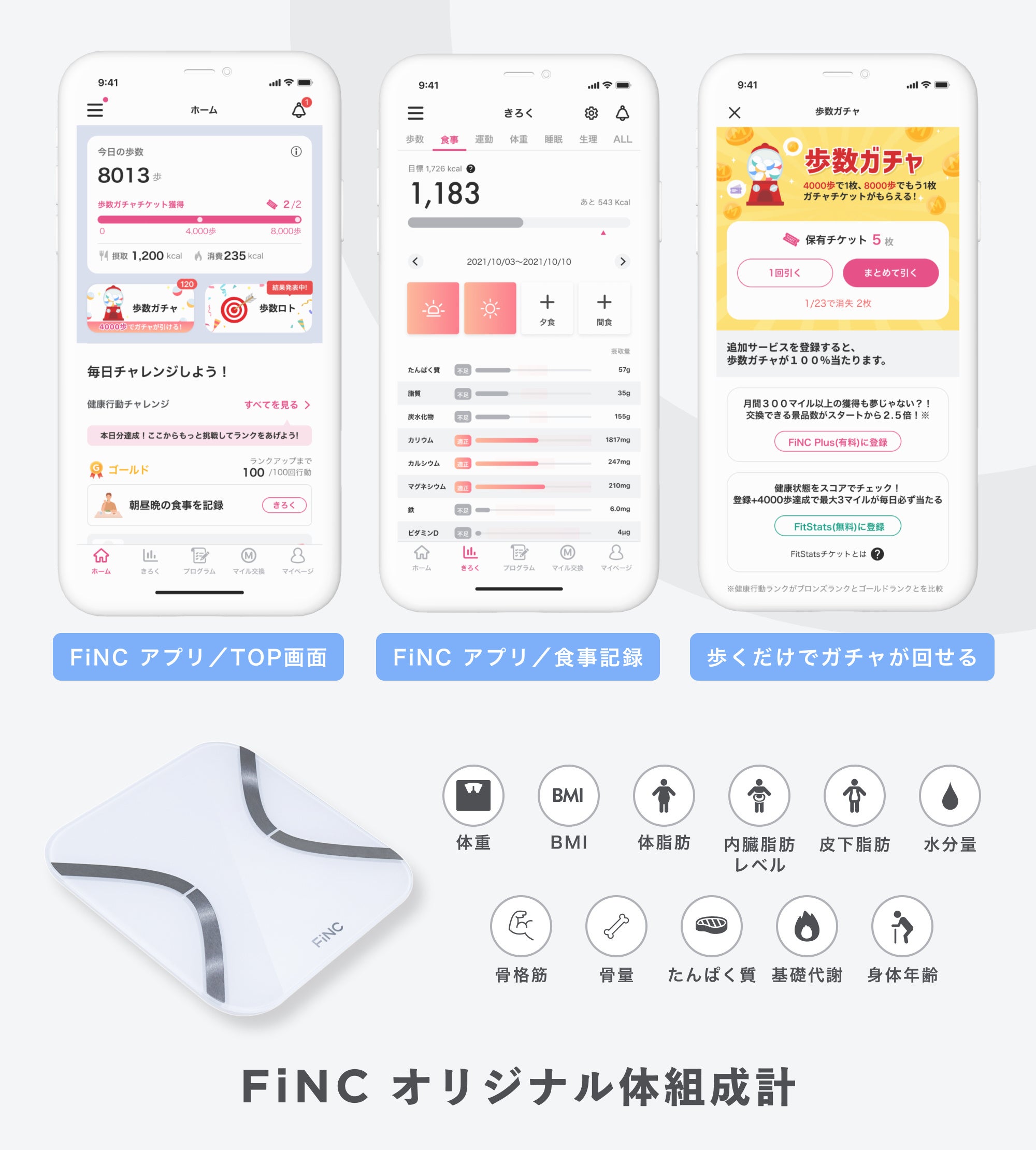 FiNCアプリは、「カラダのすべてを、ひとつのアプリで」をコンセプトに、体重・歩数・食事・運動・睡眠・生理などひとつのアプリで記録が可能な健康管理アプリです。また、FiNCオリジナル体組成計と連携することにより、Bluetooth接続で、体組成計に乗るだけで自動的に体重、BMI、体脂肪、体年齢など、11個のデータも取得できます。2023年11月末には、「歩くだけでガチャが回せる歩数ガチャ」もリリースされ、4000歩、8000歩でポイント(FiNCマイル)が当たります。貯めたポイントは、コンビニ商品券、電子マネー、豪華商品に交換できます。楽しみながら健康管理できるので、病気や怪我をする前から、日常的に楽しく記録できるサービスを目指しています。