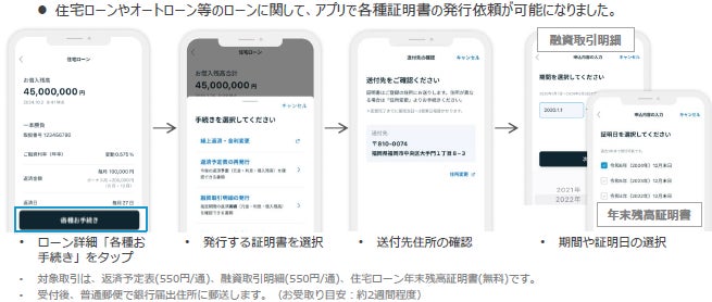 ・住宅ローンやオートローン等のローンに関して、アプリで各種証明書の発行依頼が可能になりました。