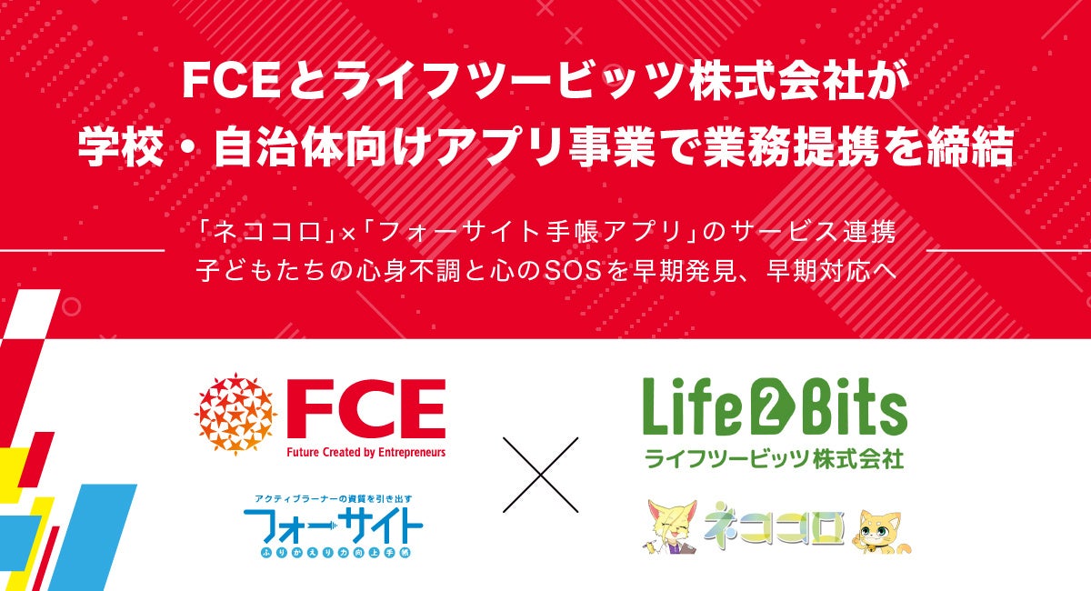 本提携は、FCEが展開する「フォーサイト手帳アプリ(フォーサイトアプリ)」と、ライフツービッツが提供する児童生徒向け心と身体の健康支援アプリ「ネココロ」をサービス連携させることで、生徒たちの心身不調や「心の小さなSOS」を早期発見し、早期に対処することが可能になります。