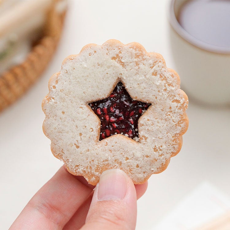 クリスマスにイギリスで食べられているおやつ”ミンスパイ”をイメージしたクッキーです。バターとアーモンドをたっぷり使用したリッチな生地に4種のスパイスをほんのり効かせ、甘酸っぱい自家製ラズベリージャムをサンドしました。見た目も雪を連想するような表面と、抜いた星形がクリスマスらしいクッキーになっています。