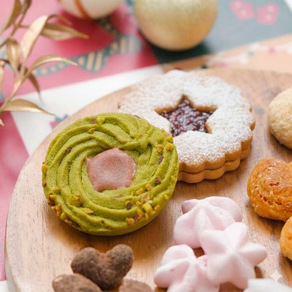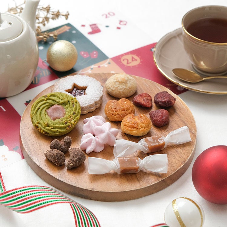 ピスタチオやラズベリーを使った季節のクッキー、スパイスを効かせた焼き菓子、冬に人気の濃厚ナッツ、そしてカカオハスクとスパイス香るオリジナルクリスマスティーなど、バラエティ豊かな8種のおやつと紅茶を詰め合わせました。