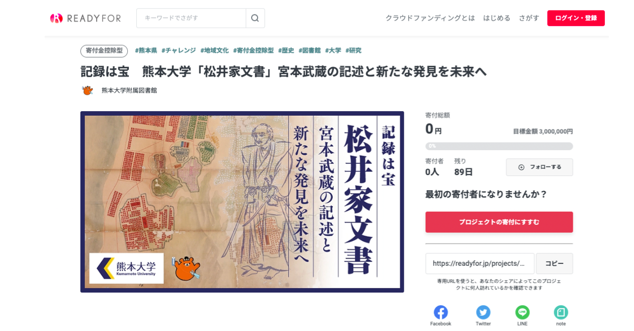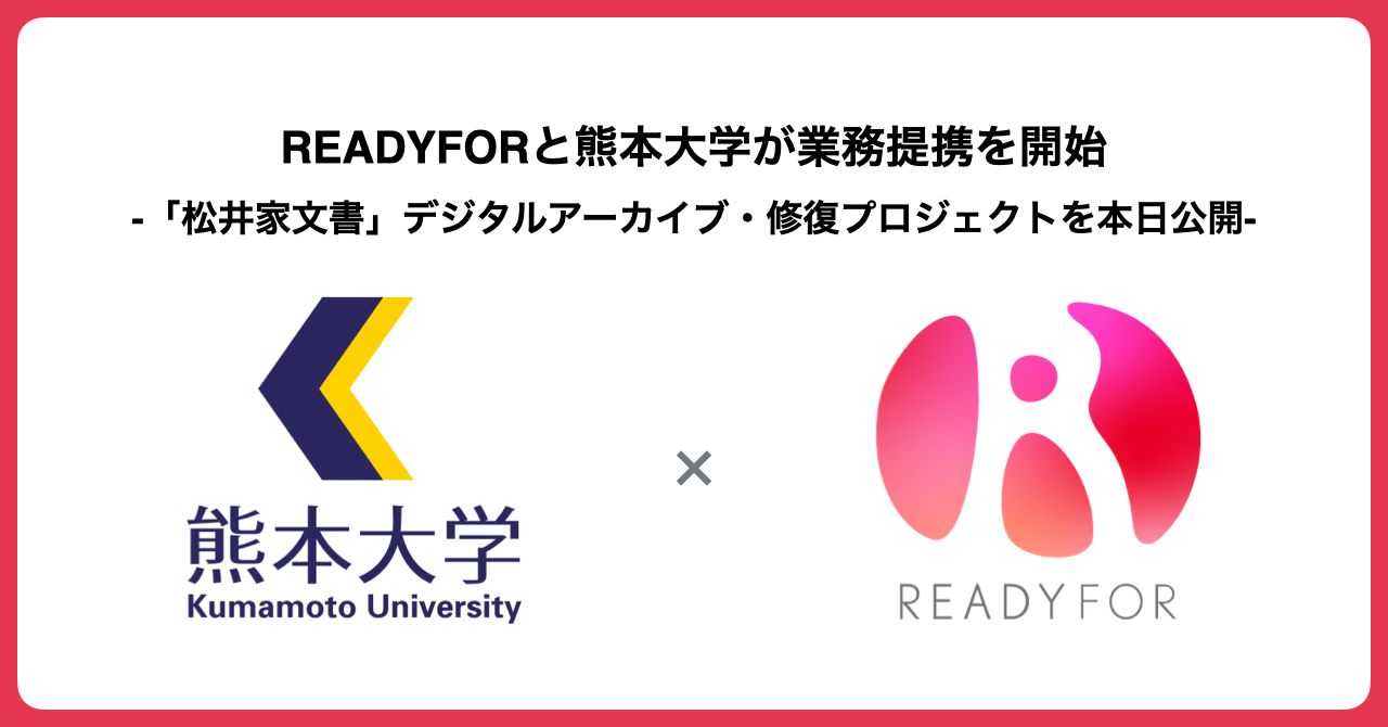 日本初・国内最大級のクラウドファンディングサービス「READYFOR」を運営するREADYFOR株式会社(本社:東京都千代田区、 代表:米良はるか)と熊本大学(所在地:熊本県熊本市、学長:小川久雄)は業務提携を締結し、本日、第一号としてクラウドファンディングプロジェクト「記録は宝 熊本大学『松井家文書』宮本武蔵の記述と新たな発見を未来へ」を公開いたしました。