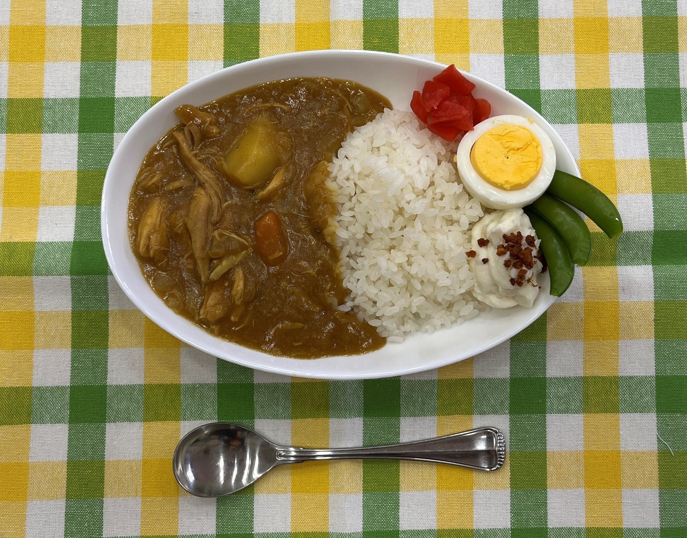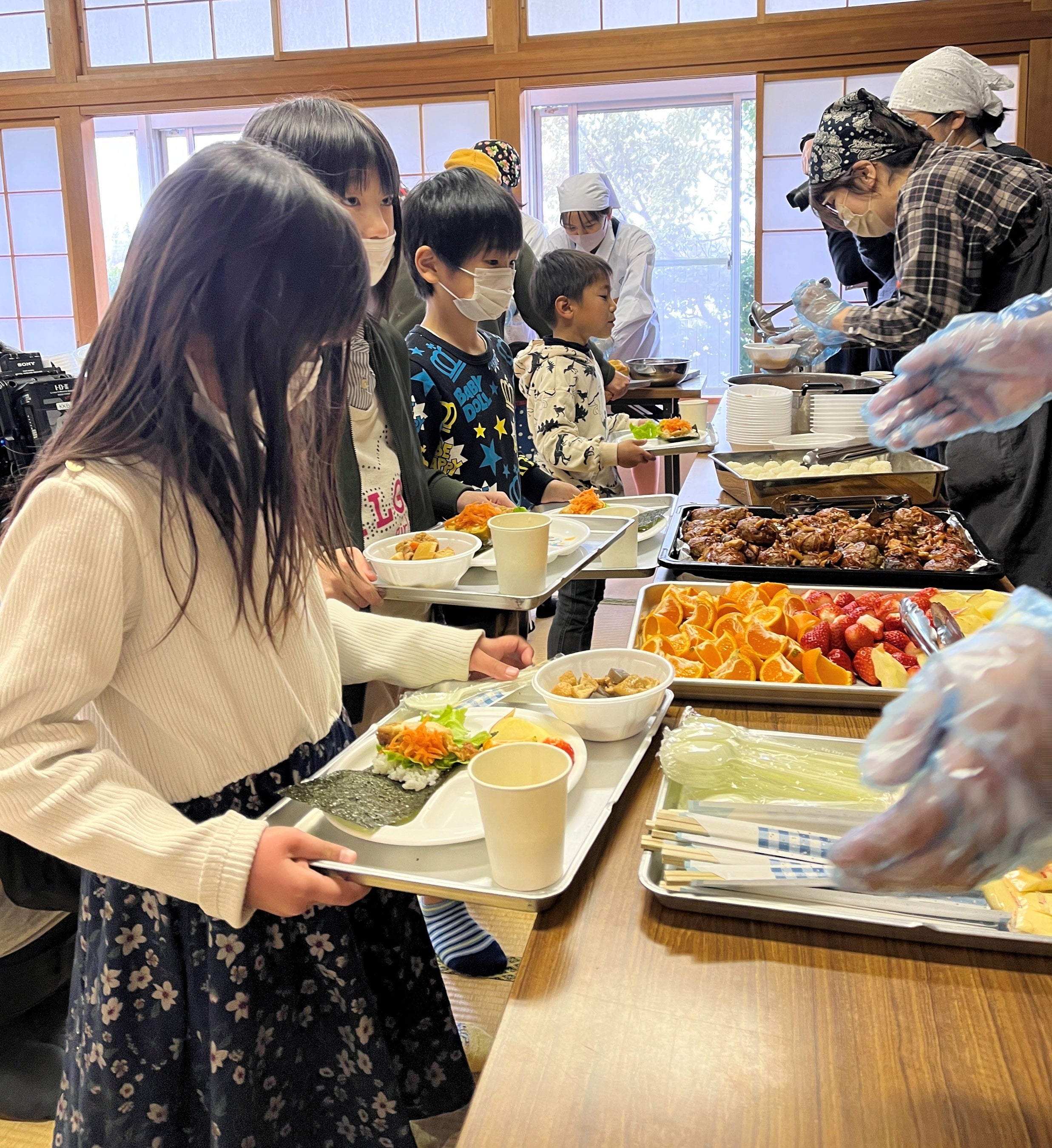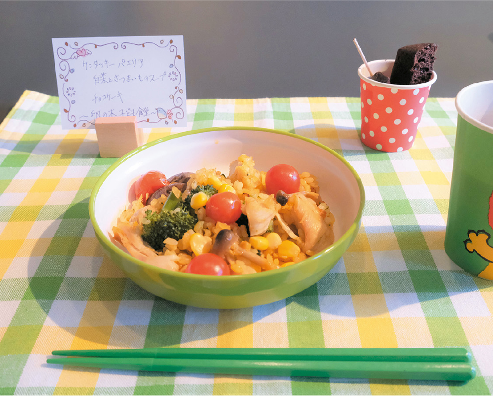 例) こども食堂等での配膳の様子、提供メニュー(パエリア・カレー)