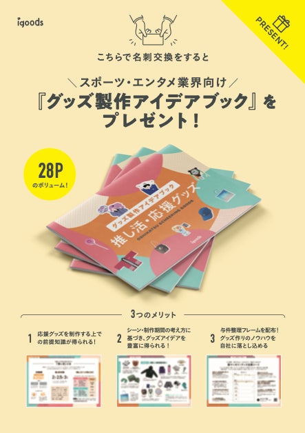 当日はIP専門チームも複数名常駐予定です。当日はIP専門チームも複数名常駐予定です。名刺交換をしていただいた皆様には、「納期」「デザイン」のお悩みを解決し、すぐに活用できる『推し活・応援グッズ制作アイデアブック』や、コンセプトのマンネリ打破のヒントが詰まった『コンセプトブック』をお渡しします。