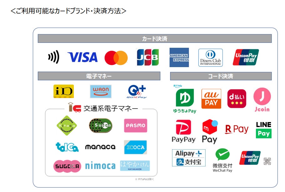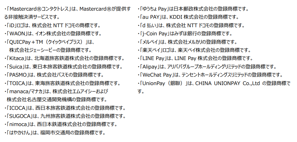 | ご利用可能な決済方法 | ・「Visa」・「Mastercard®」など国際ブランドのICカード、磁気カードによる決済、およびタッチ決済 ・「iD」・「WAON」・各種交通系などの電子マネー・各種コード決済 |