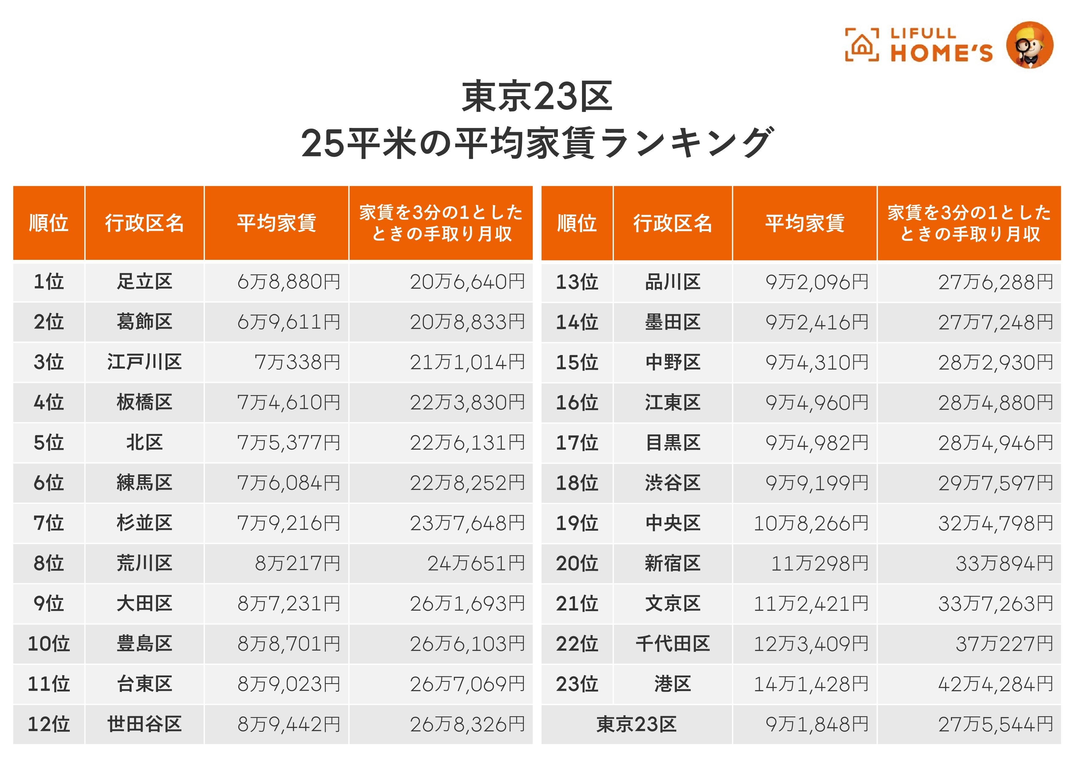 家賃の目安としては「手取り収入の3分の1以内」というものが一般に言われます。そこで、「東京23 区 25平米の平均家賃ランキング」をもとに、家賃を「手取り収入の3分の1」に当てはめた場合の手取り月収の目安もまとめました。東京23区内で25平米の物件に住む場合の手取り月収は単純計算で、20万6,640円~42万4,284円程度となりました。