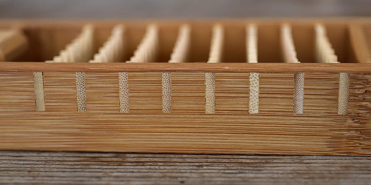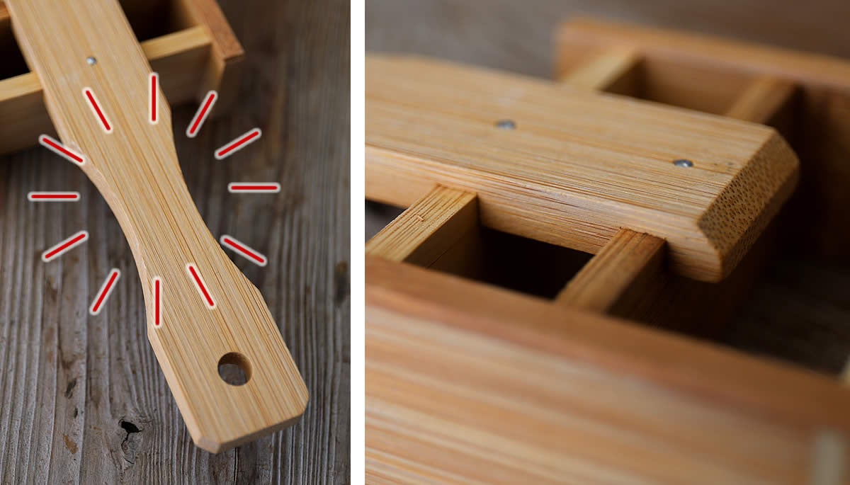 製造を支えているのは、熟練の職人による手仕事です。鬼おろし本体は、厚みのある孟宗竹を割り、削り出し、磨き上げて作られています。さらに鋭角な鬼歯の部分も、しっかりとはめ込みで固定された頑丈な構造となっており、見た目の迫力だけでなく、日々の調理に安心して使える丈夫さも兼ね備えています。持ち手の握りやすさや、吊るして保管できる穴など、使い勝手にも細やかな工夫を重ねてきました。