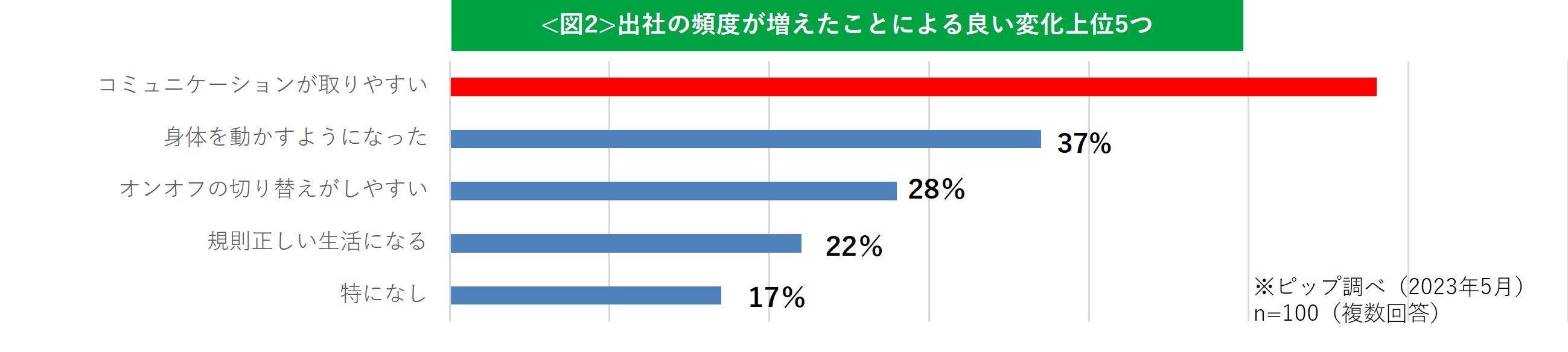 出社の頻度が増えたと回答した100名を対象に「出社の頻度が増えたことによる良い変化」を聞いたところ、「コミュニケーションが取りやすい」と回答した人が58%と最も多く、次いで「身体を動かすようになった」(37% )、「オンオフの切り替えがしやすい」(28%) という結果になりました。<図2>