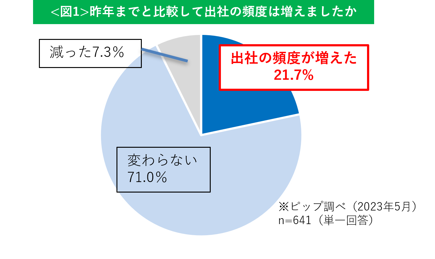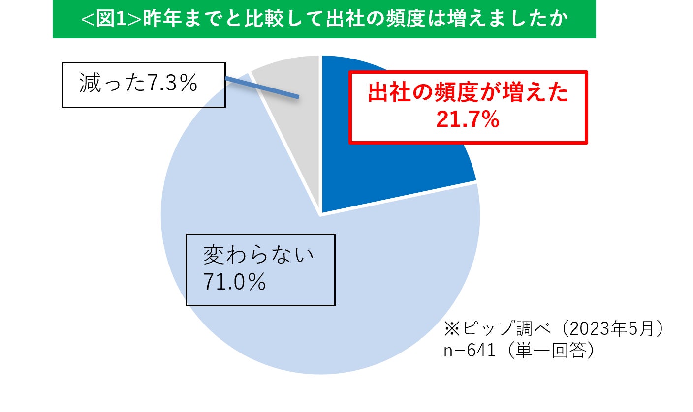 昨年までと比較し、今年度は出社の頻度が変化したかという質問に対し、「変わらない」と回答した方が71.0%と最も多かった一方で、全体の21.7%の方が「出社の頻度が増えた」と回答しました。<図1>