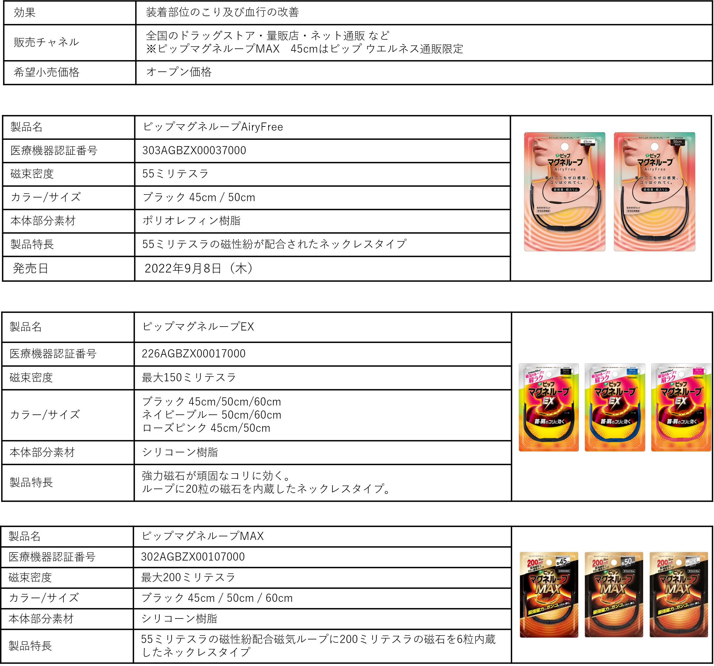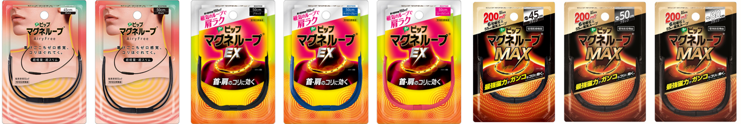 シリーズ最強200ミリテスラの強力磁力がガンコなコリにしっかり効く「ピップマグネループMAX」、ベーシックレベルの磁気治療器を使用したい方におすすめの「ピップマグネループEX」、超軽量&超スリムで”着けごこちゼロ感覚の「ピップマグネループ Airyfree」の3種類からお選びいただけます。