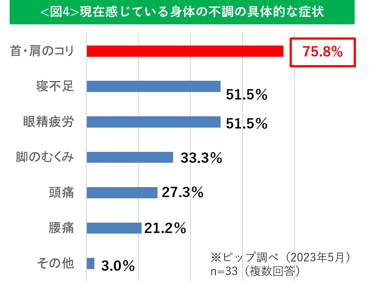 「出社の頻度が増えたことによる悪い変化」として、「身体の不調」と回答した33名に対し、現在感じている体の不調の具体的な症状について聞いた質問では、実に75.8%の方が「首・肩のコリ」と回答しました。