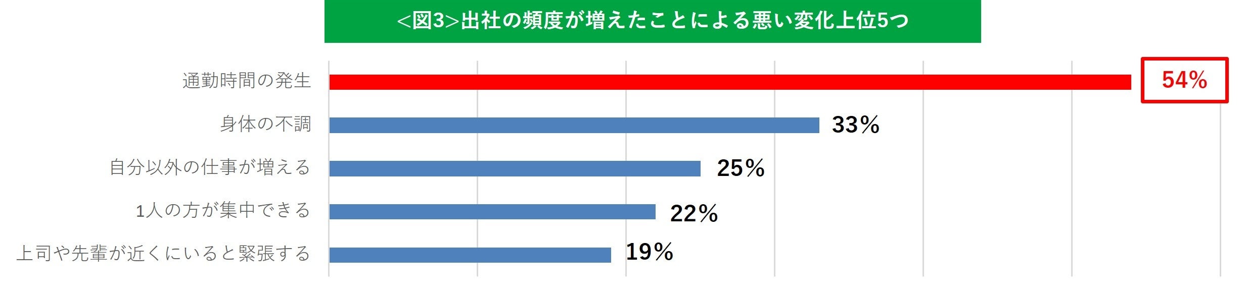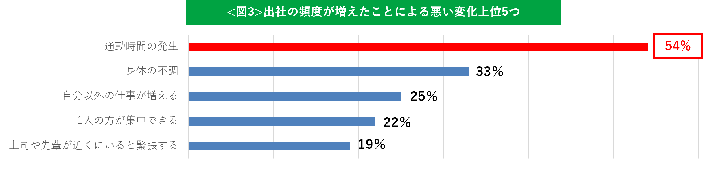 続いて「出社の頻度が増えたことによる悪い変化」について聞くと、「通勤時間の発生」と回答した人が54%と最も多い結果となり、次に「身体の不調」(33% )、「自分以外の仕事が増える」(25%) という結果に。 <図3>
