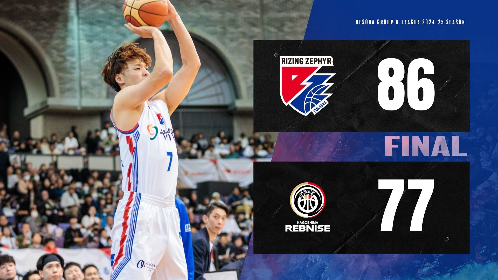 2024年11月23日(土)に開催した、りそなグループB.LEAGUE 2024-25シーズン【鹿児島レブナイズvs.ライジングゼファーフクオカ】の結果は、 “鹿児島77-86福岡”で福岡の勝利となりましたことをお知らせいたします。