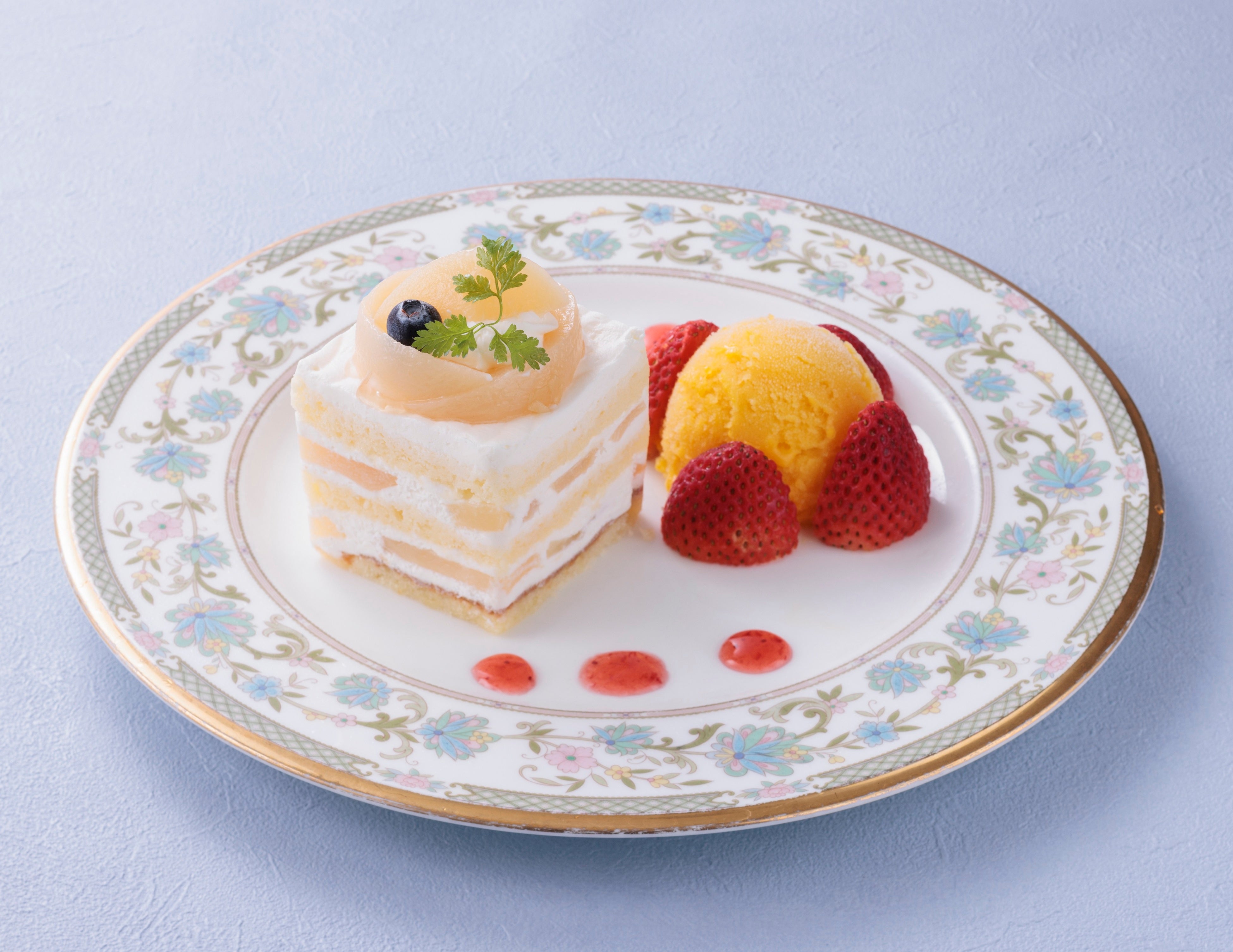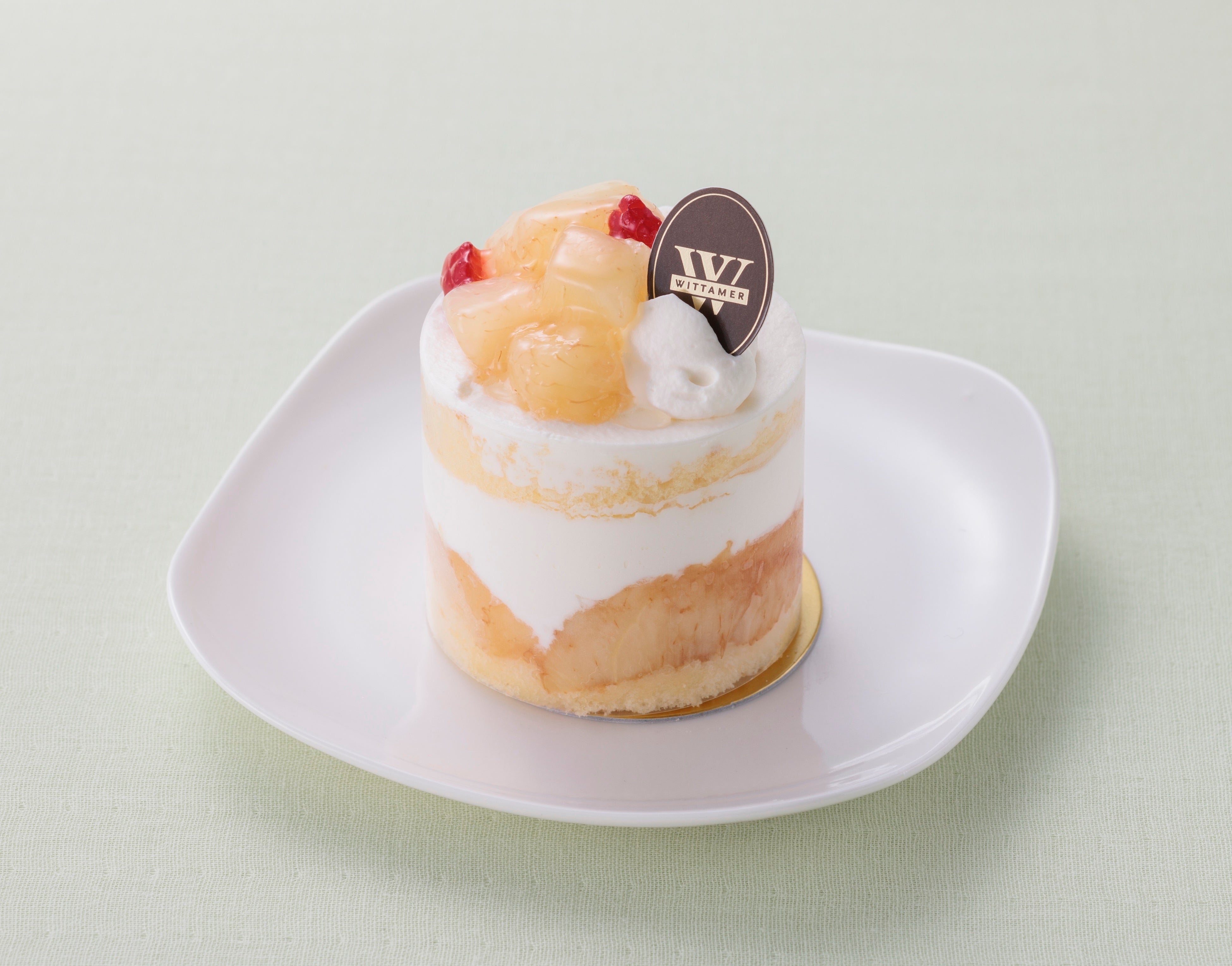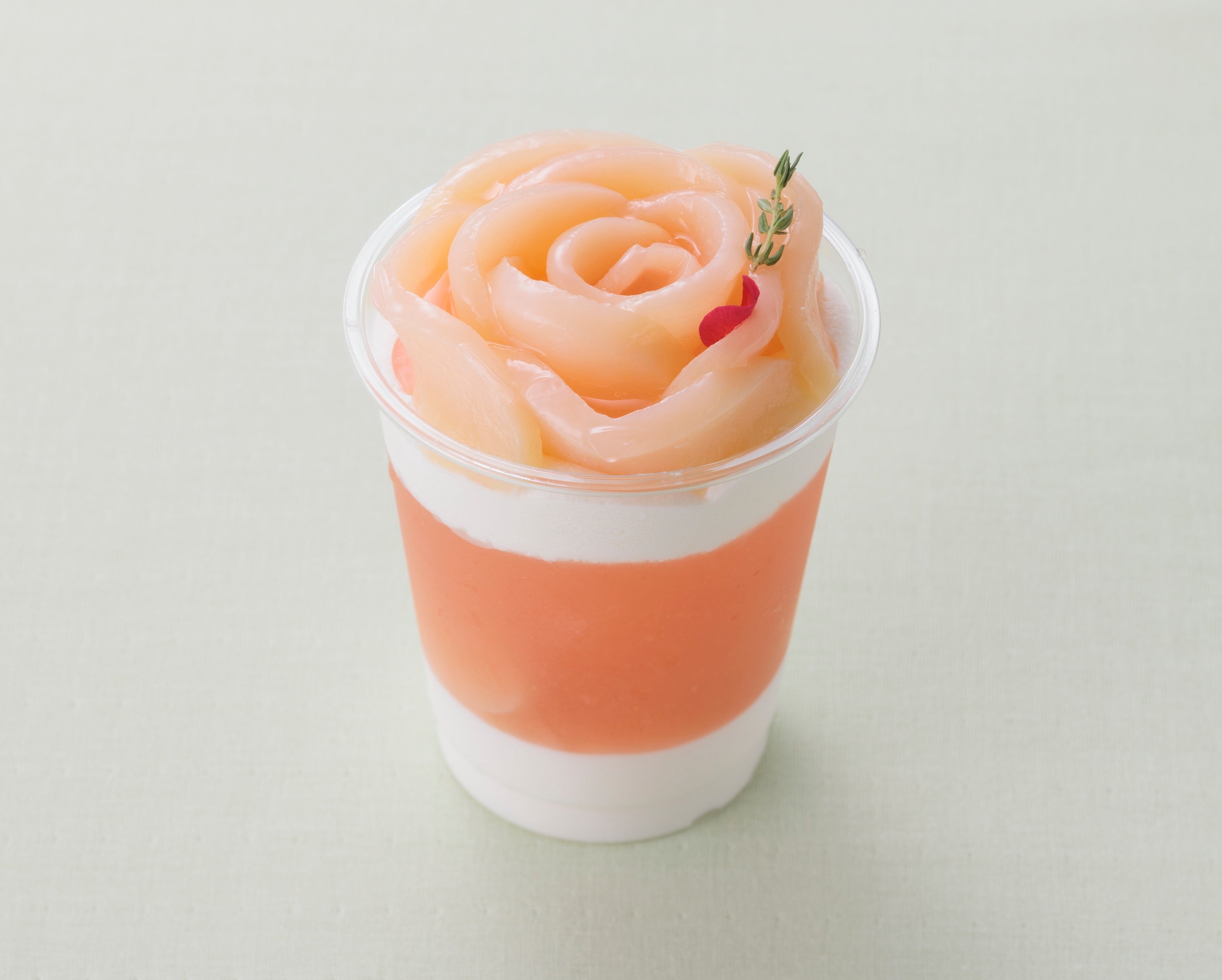 バニラ練乳ムースを土台に桃の果肉をたっぷりと使用したゼリーを重ね、堂島ロールのクリームを絞り、華やかなバラに見立てた桃を飾りました。