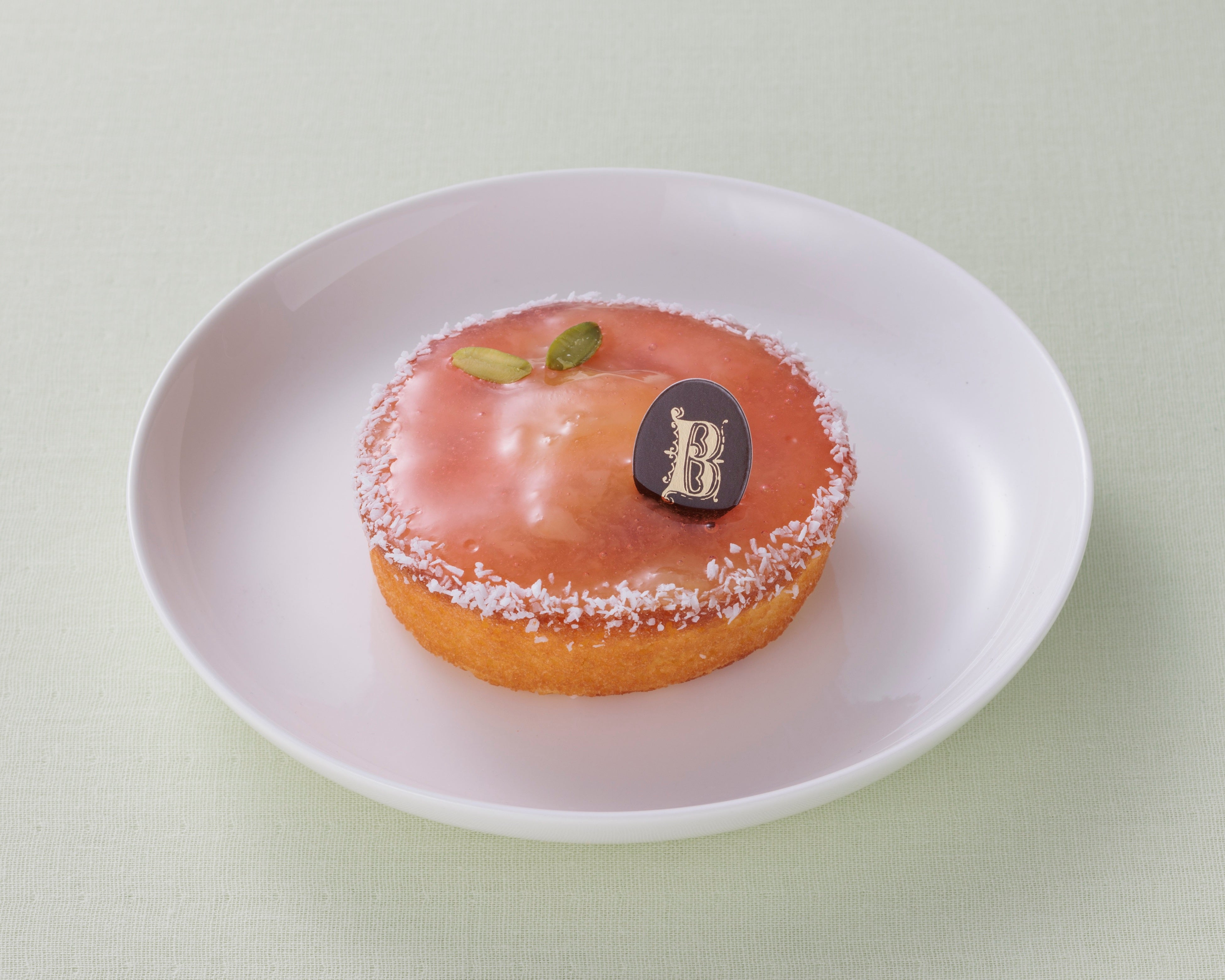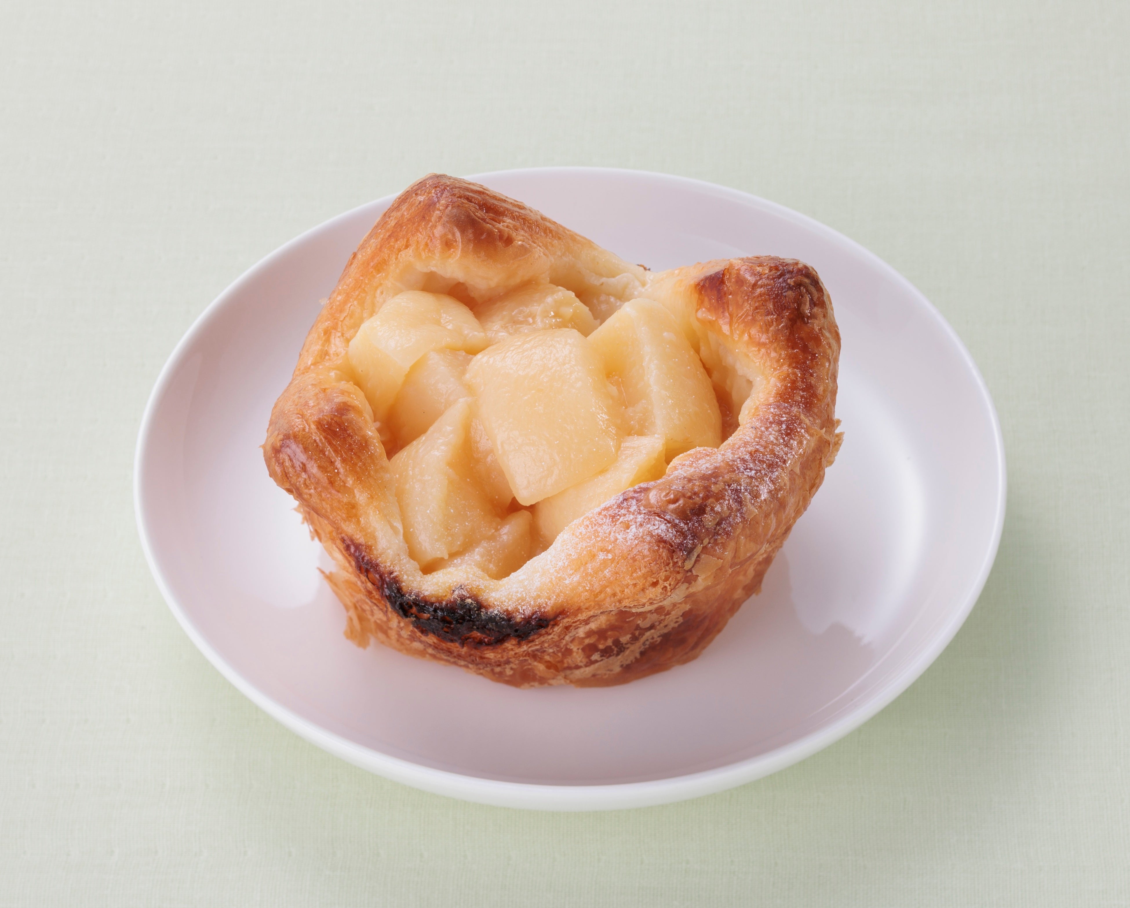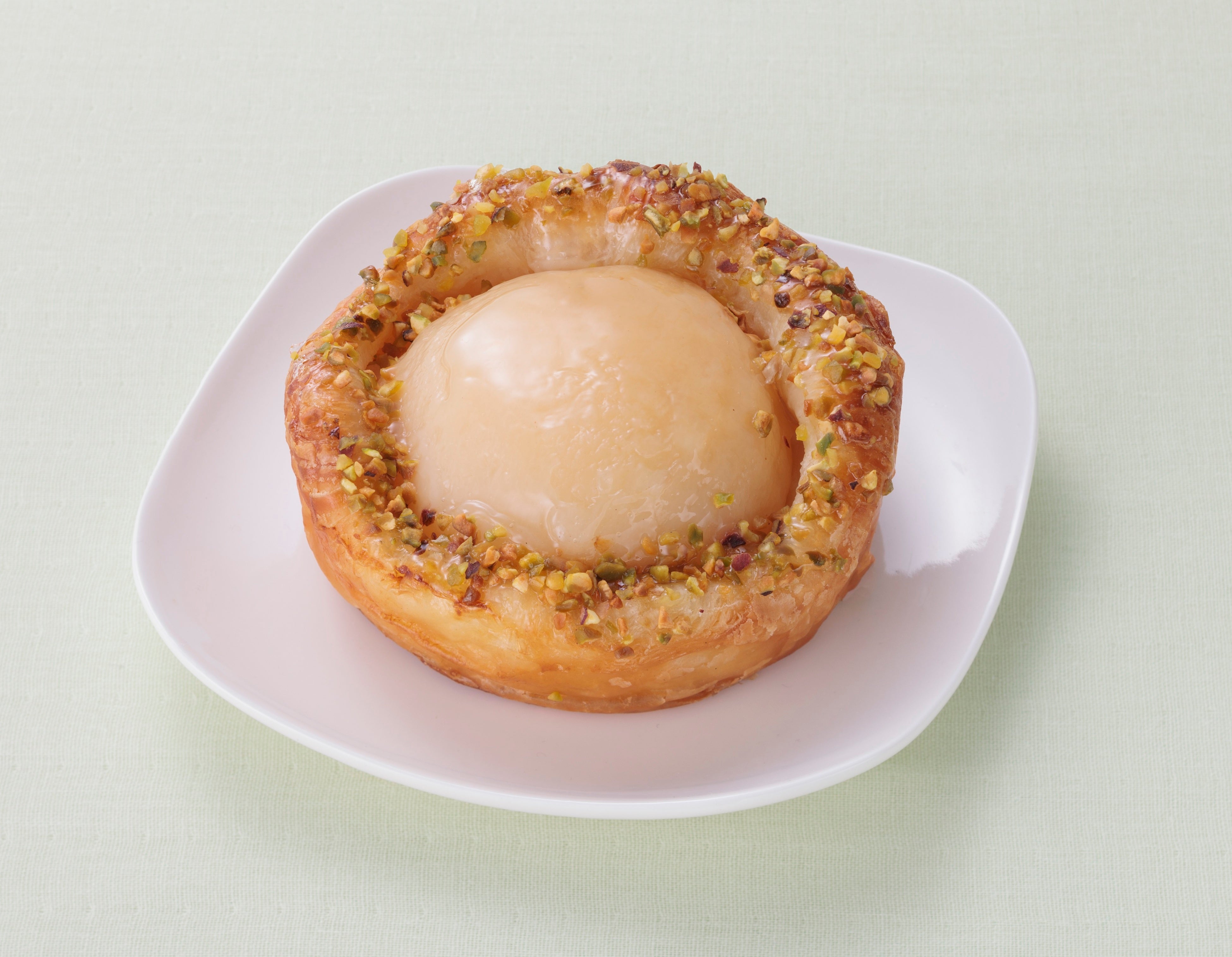 デニッシュ生地にチーズクリームと白桃を重ねて焼き上げました。トッピングのピスタチオがアクセントです。