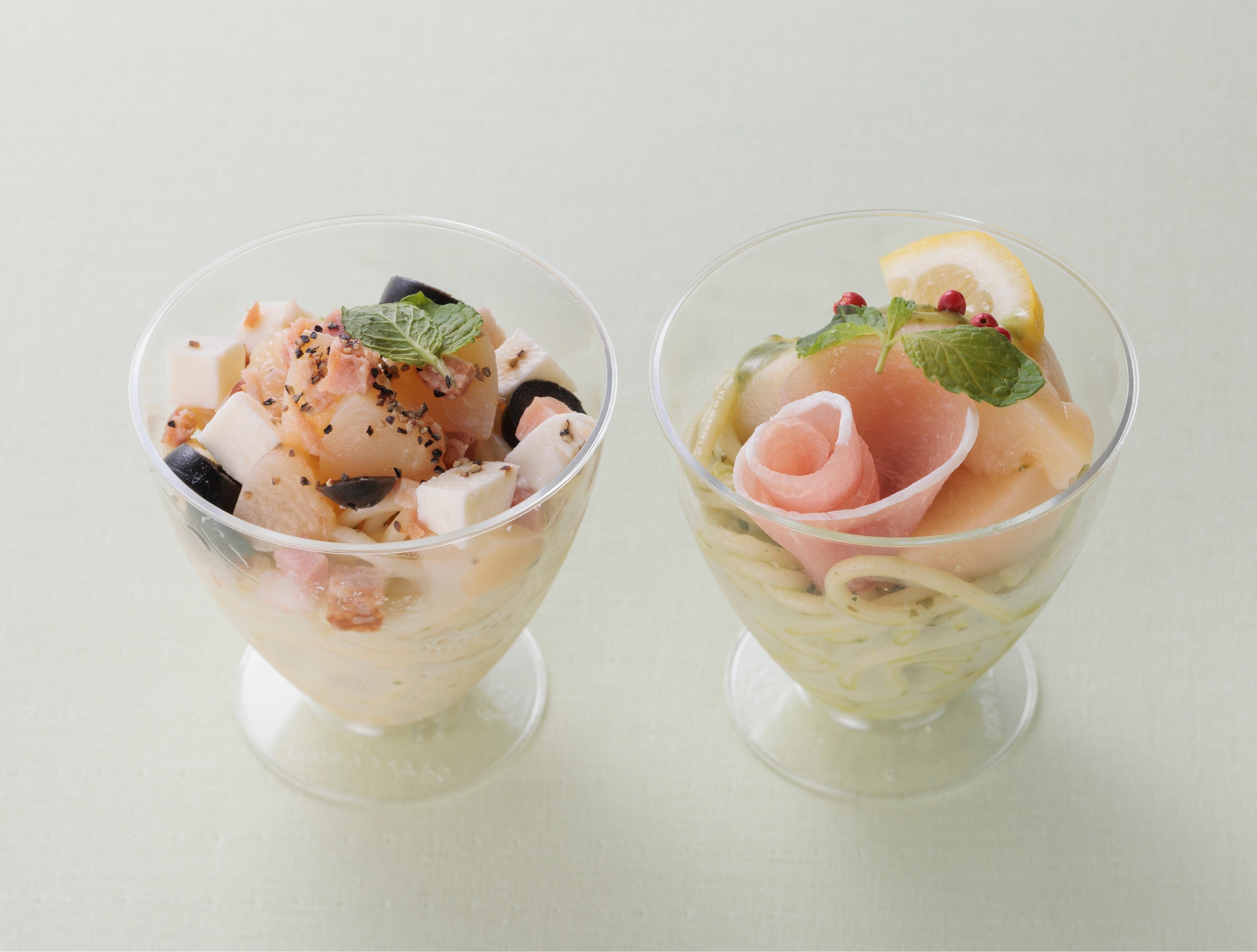 デザートのような見た目も可愛いカップ入りのパスタ。カルボナーラパスタは、モッツアレラチーズとベーコン、ブラックオリーブにブラックペッパーをあわせました。
