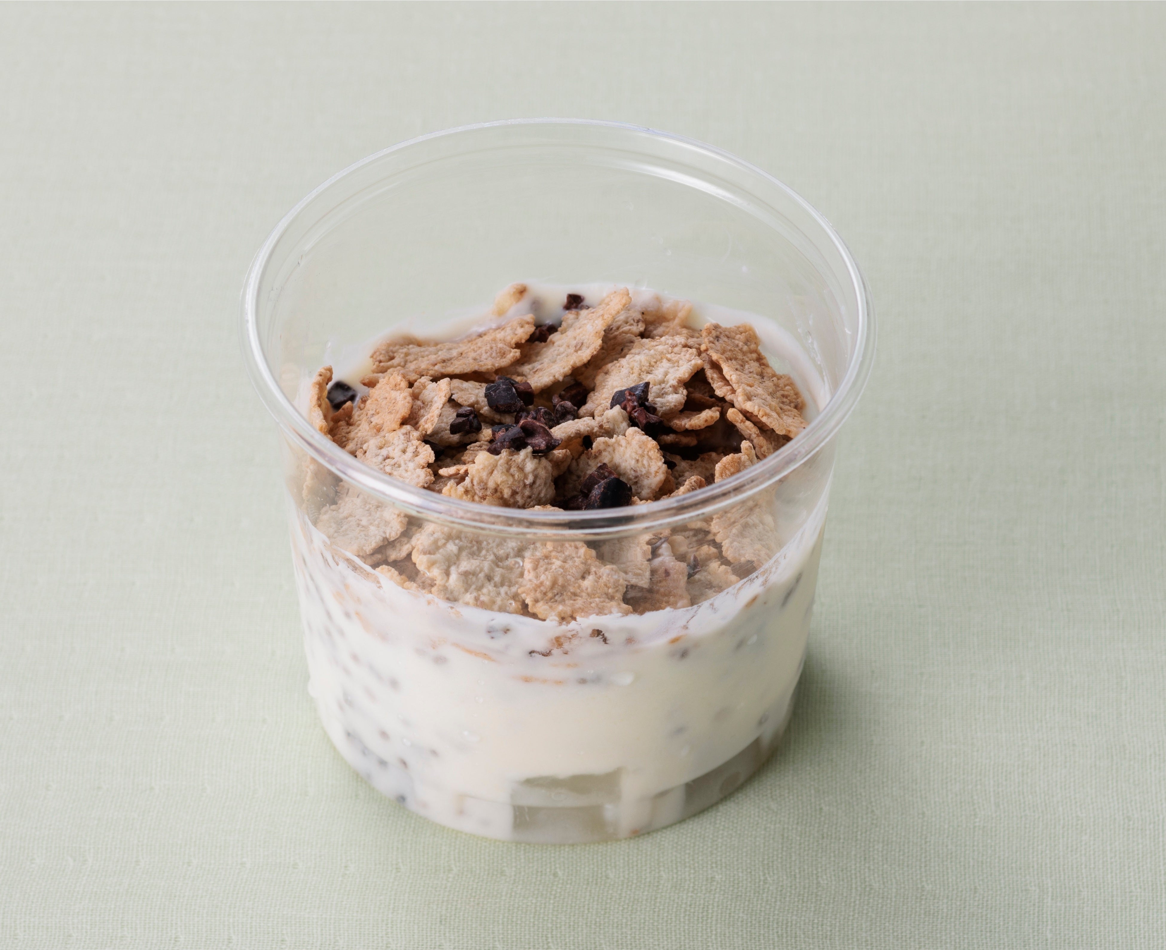 チアシード、ドラゴンフルーツ、ナタデココと桃の入ったヨーグルトに、玄米シリアルとカカオニブをトッピングしました。