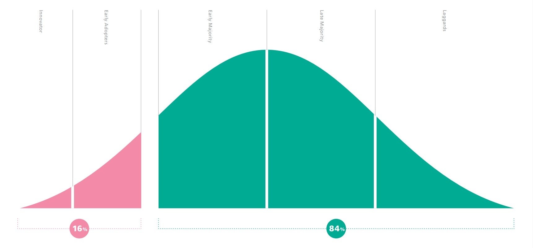 「サステナブル・グリーン」と「ワイルド・ピンク」の2色となります。この2色の配色は、「サステナブル・グリーン」と「ワイルド・ピンク」が84:16の比率となります。この比率は、イノベーター理論から着想を得ました。「ワイルド・ピンク」をイノベーターとアーリーアダプターの合算の比率である16%に合わせ、デザインで使用していきます。