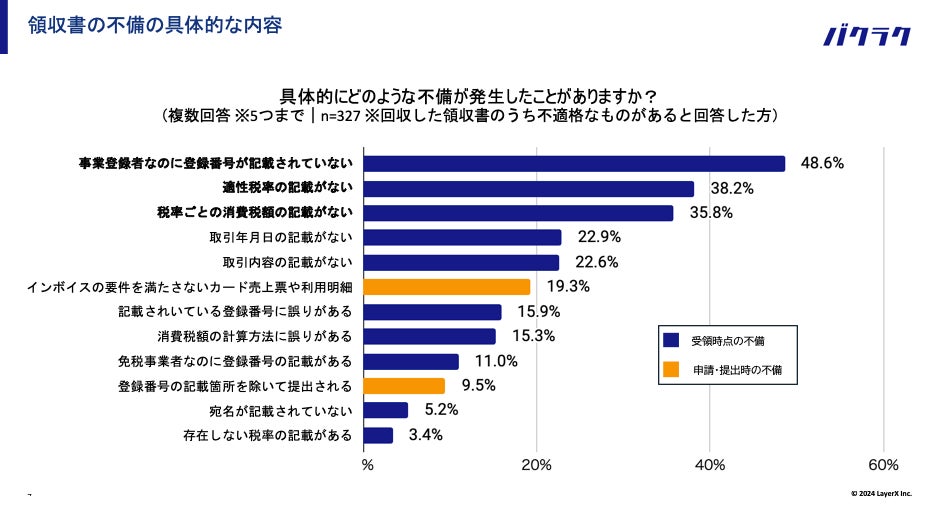 「インボイス制度の要件を満たさない不適切な領収書」について、具体的にどのような不備が発生したのかを質問したところ、48.6%が「登録事業者なのに登録番号の記載がされていない」が最も多い回答となり、次いで「適用税率の記載がない」(38.2%)、「税率ごとに区分した消費税額の記載がない」(35.8%)となりました。