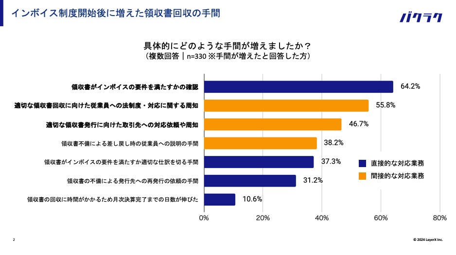 2. 手間が増えた業務TOP3は、1位「領収書がインボイスの要件を満たすかの確認」(64.2%)、2位「適切な領収書回収に向けた従業員への法制度・対応に関する周知」(55.8%)、3位「適切な領収書発行に向けた取引先への対応依頼や周知」(46.7%)