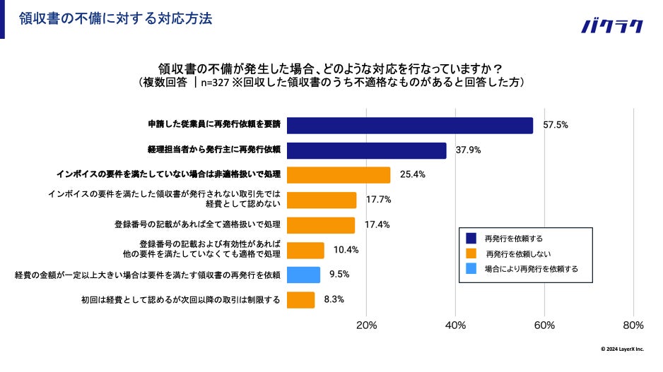 不備が発生した場合にどのような対応を行なっているかを質問したところ、1位「申請した従業員に再発行依頼を要請」(57.5%)、2位「経理担当者から発行主へ再発行依頼」(37.9%)、3位「インボイス制度の要件を満たしていない場合は非適格扱いで処理」(25.4%)となりました。