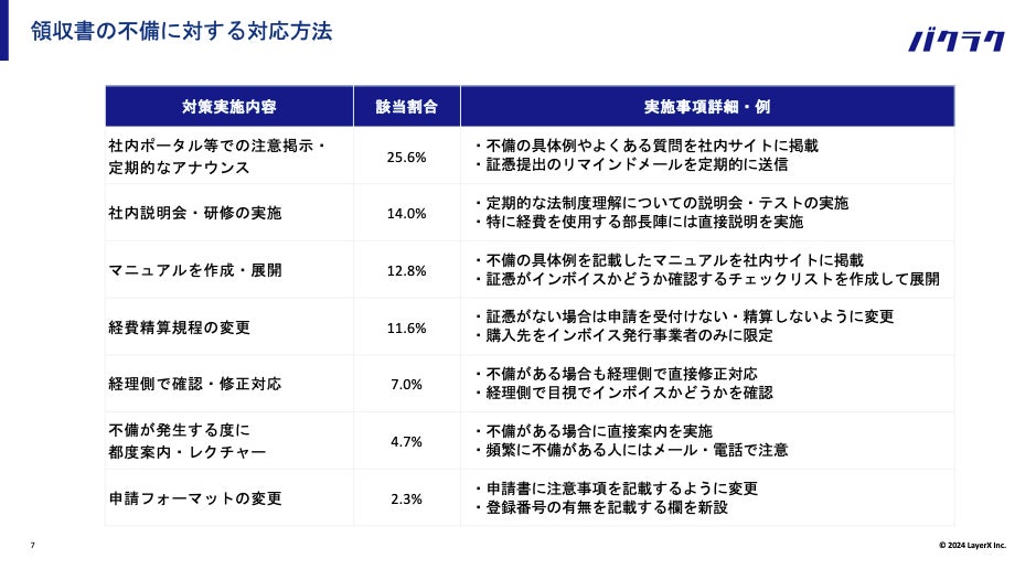 6. 41.2%が領収書回収のための対策を実施。実施している対策TOP3は、1位「社内ポータル等での注意掲示・定期的なアナウンス」(25.6%)、2位「社内説明会・研修の実施」(14.0%)、3位「マニュアルを作成・展開」(12.8%)