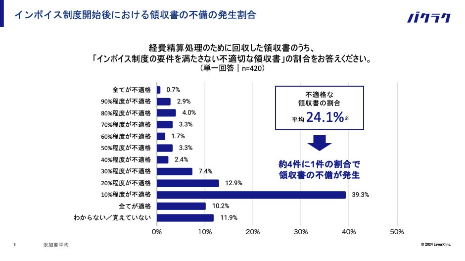 インボイス制度の開始以降、「経費精算」のために回収した領収書のうち、「インボイス制度の要件を満たさない不適切な領収書」の割合についてを質問したところ、39.3%が「10%程度が不適格」、12.9%が「20%程度が不適格」、7.4%が「30%程度が不適格」と回答しました。また、平均値を算出したところ24.1%となり、領収書の約4件に1件の割合で不備が発生していることがわかります。
